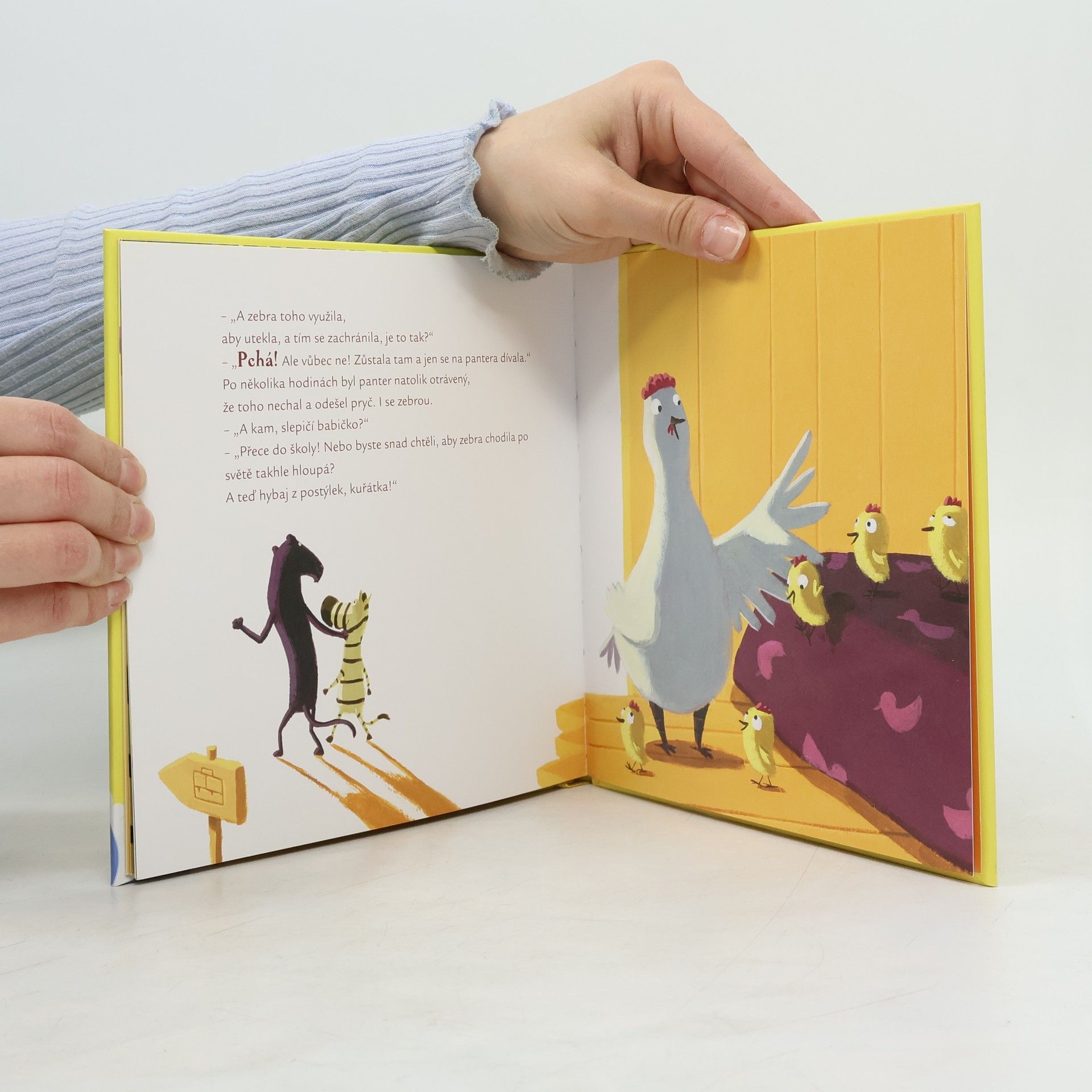 Malá zebra si myslela, že je chytřejší než ostatní a nemusí ani chodit do školy. Až potkala pantera, který jí začal klást podivné otázky. Stačily jí její znalosti, aby se před šelmou zachránila? To se dozvíte v Příbězích slepičí babičky.