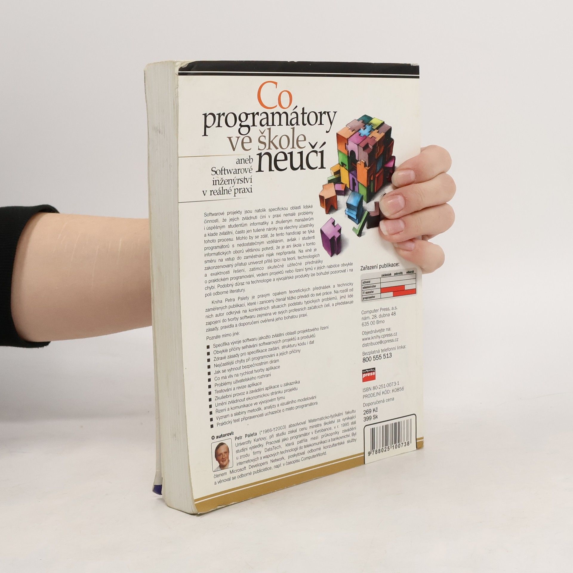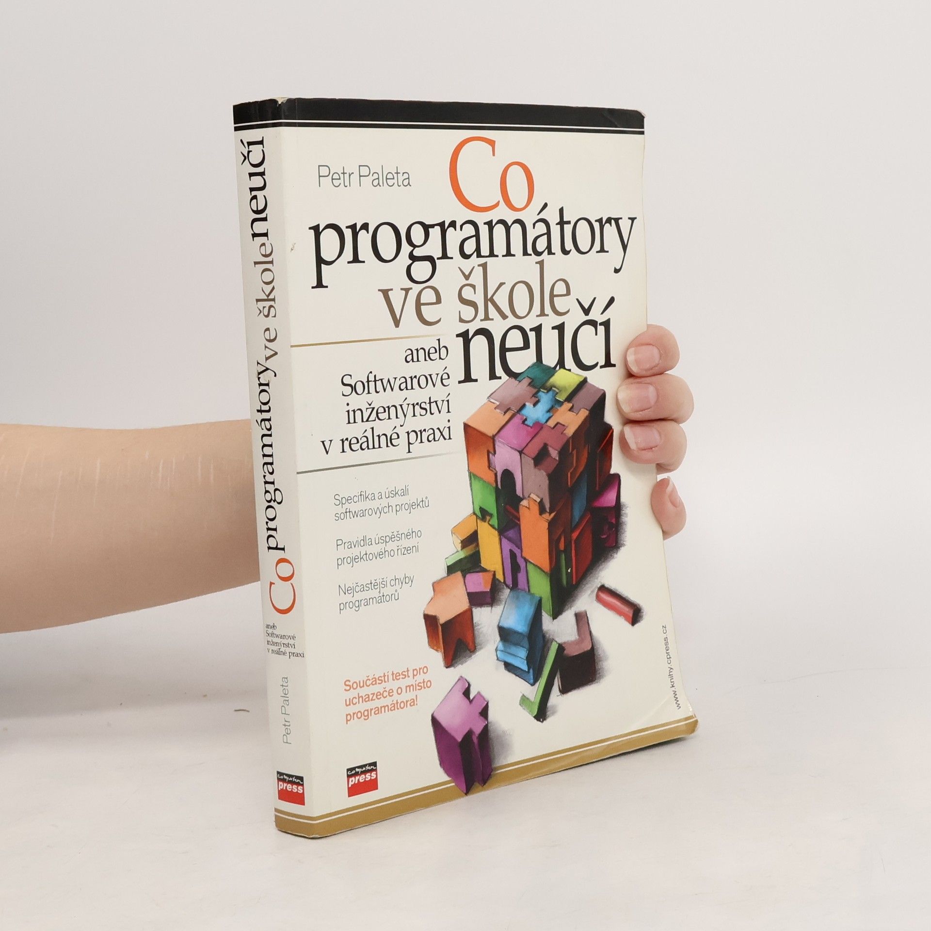 Softwarové projekty jsou natolik specifickou oblastí lidské činnosti, že jejich zvládnutí činí v praxi nemalé problémy i úspěšným studentům informatiky a zkušeným manažerům a klade zvláštní, často jen tušené nároky na všechny účastníky tohoto procesu. Mohlo by se zdát, že tento handicap se týká programátorů s nedostatečným vzděláním, avšak i studenti informatických oborů většinou potvrdí, že je ani škola v tomto směru na vstup do zaměstnání nijak nepřipravila. Na vině je zakonzervovaný přístup univerzit příliš lpící na teorii, technologiích a exaktnosti řešení, zatímco skutečně užitečné přednášky o praktickém programování, vedení projektů nebo řízení týmů v jejich nabídce obvykle chybí. Podobný důraz na technologie a vývojářské produkty lze bohužel pozorovat i na poli odborné literatury. Kniha Petra Palety je pravým opakem teoretických přednášek a technicky zaměřených publikací, které i zanícený čtenář těžko převádí do své práce. Na rozdíl od nich autor odkrývá na konkrétních situacích podstatu typických problémů, jimž lidé zapojení do tvorby softwaru zejména ve svých profesních začátcích čelí, a představuje zásady, pravidla a doporučení ověřená jeho bohatou praxí.