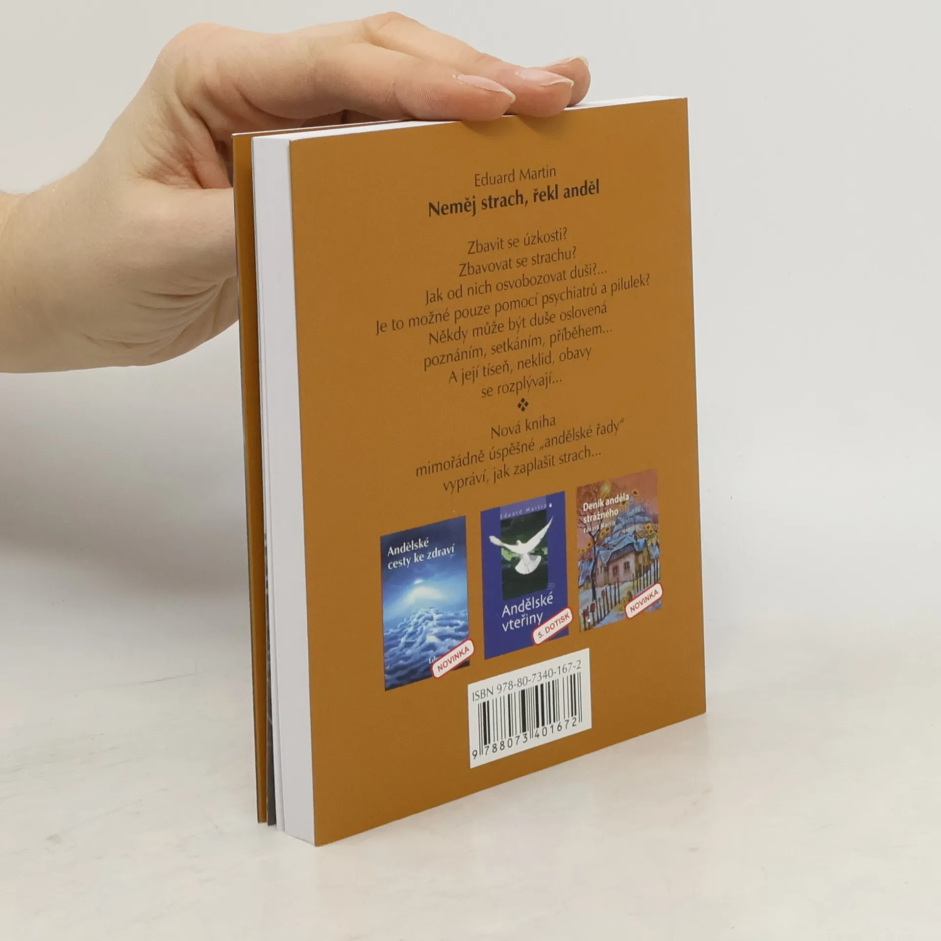 Zbavit se úzkosti? Zbavovat se strachu? Jak od nich osvobozovat duši?... Je to možné pouze pomocí psychiatrů a pilulek? Někdy může být duše oslovená poznáním, setkáním, příběhem... A její tíseň, neklid, obavy se rozplývají... Nová kniha mimořádně úspěšné „andělské řady“ vypráví, jak zaplašit strach... Příběhy autorovy „andělské knižnice“ po léta nacházejí širokou obec čtenářů v Čechách i v zahraničí. Nový svazek oslovuje čtenáře nadějí, poznáním a láskou podobně jako předešlé mimořádně úspěšné knihy jeho „andělské řady“.