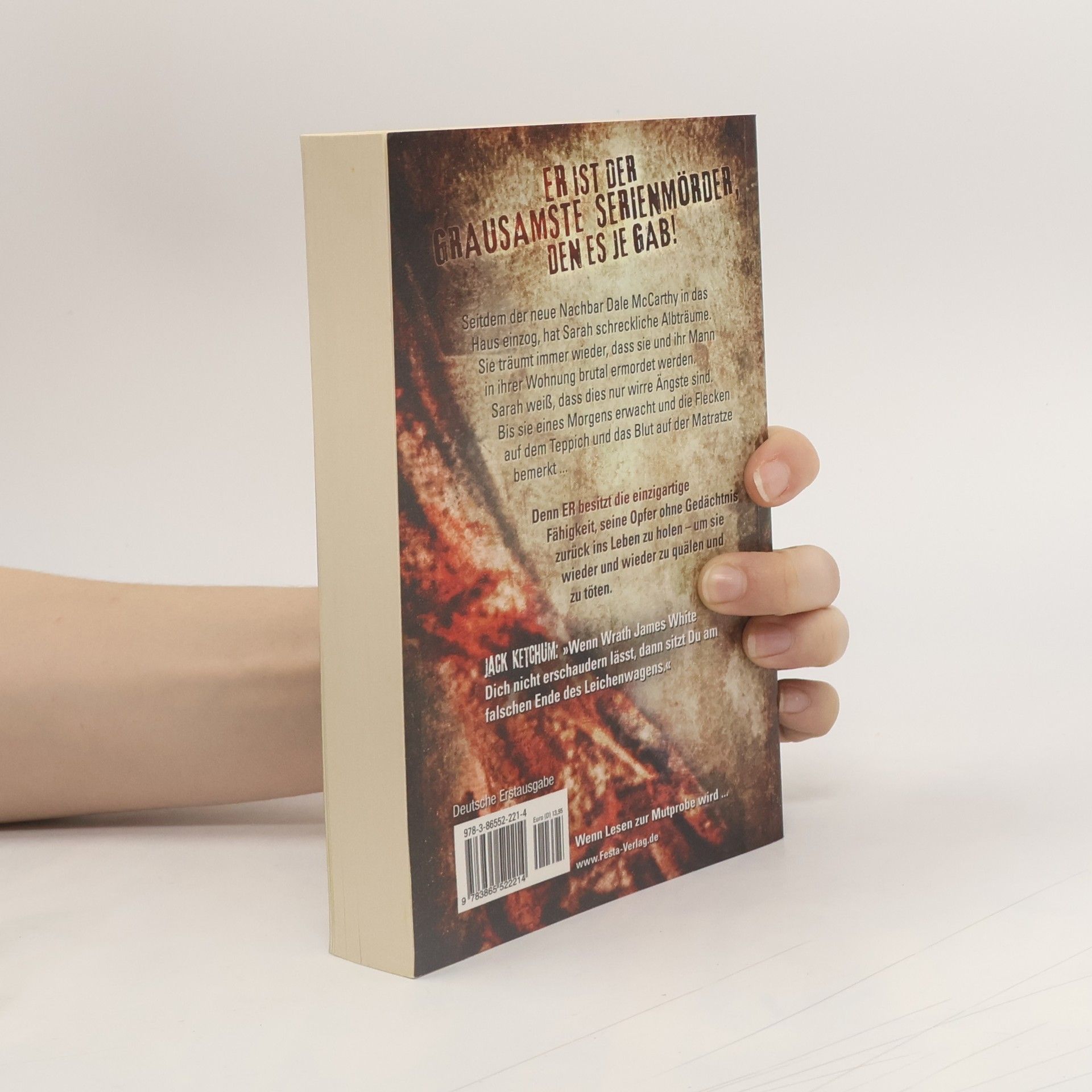 ER ist der grausamste Serienmörder, den es je gab! Seitdem der neue Nachbar Dale McCarthy in das Haus einzog, hat Sarah schreckliche Albträume. Sie träumt immer wieder, dass sie und ihr Mann in ihrer Wohnung brutal ermordet werden. Sarah weiss, dass dies nur wirre Ängste sind. Bis sie eines Morgens erwacht und die Flecken auf dem Teppich und das Blut auf der Matratze bemerkt ... Denn ER besitzt die einzigartige Fähigkeit, seine Opfer ohne Gedächtnis zurück ins Leben zu holen - um sie wieder und wieder zu quälen und zu töten. Jack Ketchum: "Wenn Wrath James White Dich nicht erschaudern lässt, dann sitzt Du am falschen Ende des Leichenwagens."