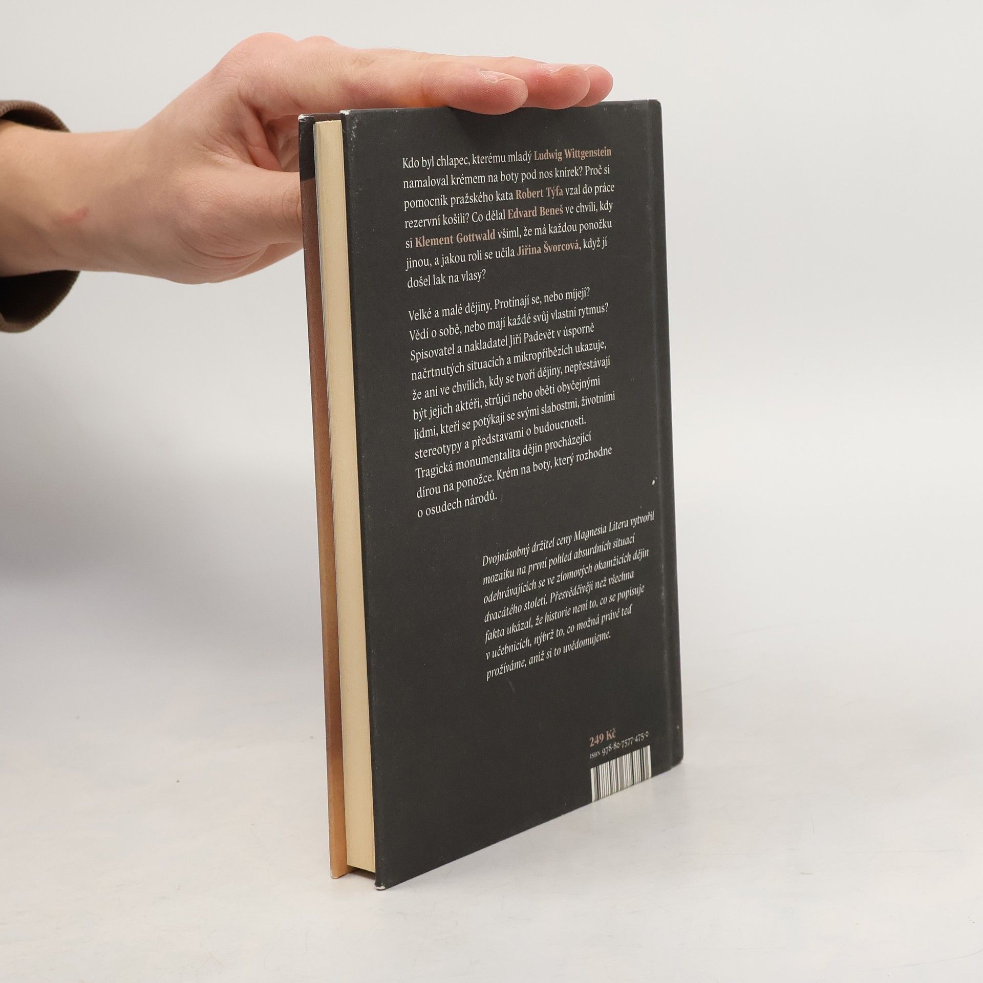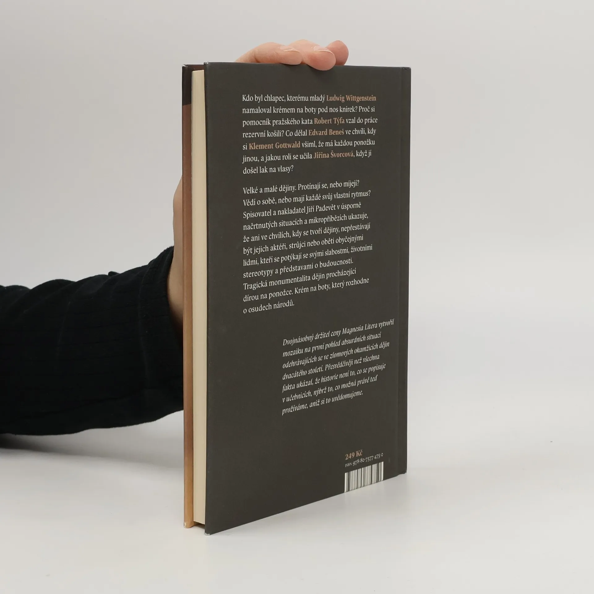 Všední lidské životy v okamžicích, které se později stanou historickými Kdo byl chlapec, kterému mladý Ludwig Wittgenstein namaloval krémem na boty pod nos knírek? Proč si pomocník pražského kata Robert Týfa vzal do práce rezervní košili? Co dělal Edvard Beneš ve chvíli, kdy si Klement Gottwald všiml, že má každou ponožku jinou, a jakou roli se učila Jiřina Švorcová, když jí došel lak na vlasy? Velké a malé dějiny. Protínají se, nebo míjejí? Vědí o sobě, nebo mají každé svůj vlastní rytmus? Spisovatel a historik Jiří Padevět v úsporně načrtnutých situacích a mikropříbězích ukazuje, že ani ve chvílích, kdy se tvoří dějiny, nepřestávají být jejich aktéři, strůjci nebo oběti obyčejnými lidmi, kteří se potýkají se svými slabostmi, životními stereotypy a představami o budoucnosti. Tragická monumentalita dějin procházející dírou na ponožce. Krém na boty, který rozhodne o osudech národů.