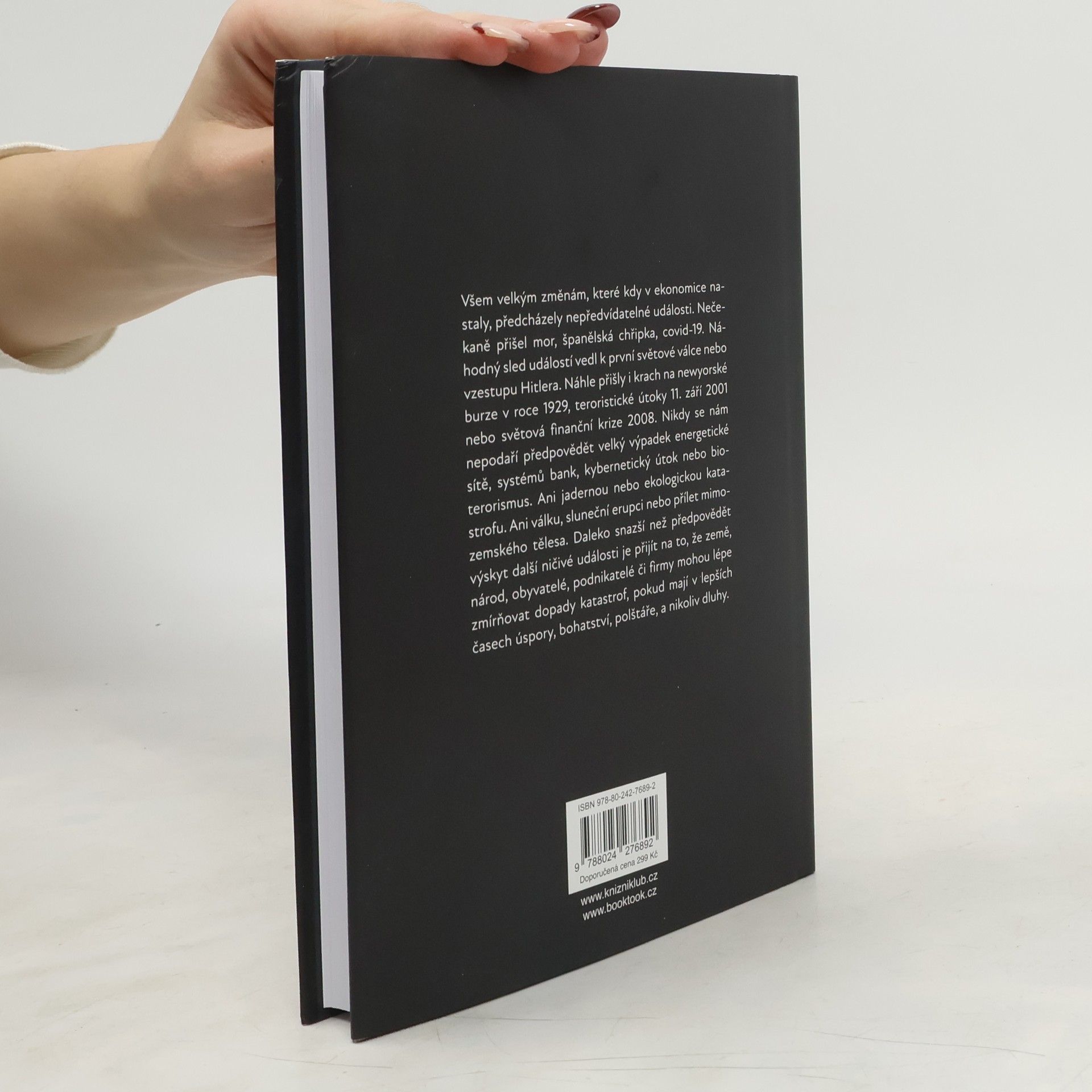 Velkým změnám, které kdy v ekonomice nastaly, předcházely nepředvídatelné události. Nečekaně přišel mor, španělská chřipka, covid-19. Náhodný sled událostí vedl k první světové válce nebo vzestupu Hitlera. Náhle přišly i krach na newyorské burze v roce 1929, teroristické útoky 11. září 2001 nebo světová finanční krize 2008. Nikdy se nám nepodaří předpovědět velký výpadek energetické sítě, systémů bank, kybernetický útok nebo bioterorismus. Ani jadernou nebo ekologickou katastrofu. Ani válku, sluneční erupci nebo přílet mimozemského tělesa. Daleko snazší než předpovědět výskyt další ničivé události je přijít na to, že země, národ, obyvatelé, podnikatelé či firmy mohou lépe zmírňovat dopady katastrof, pokud mají v lepších časech úspory, bohatství, polštáře, a nikoliv kupu dluhů.