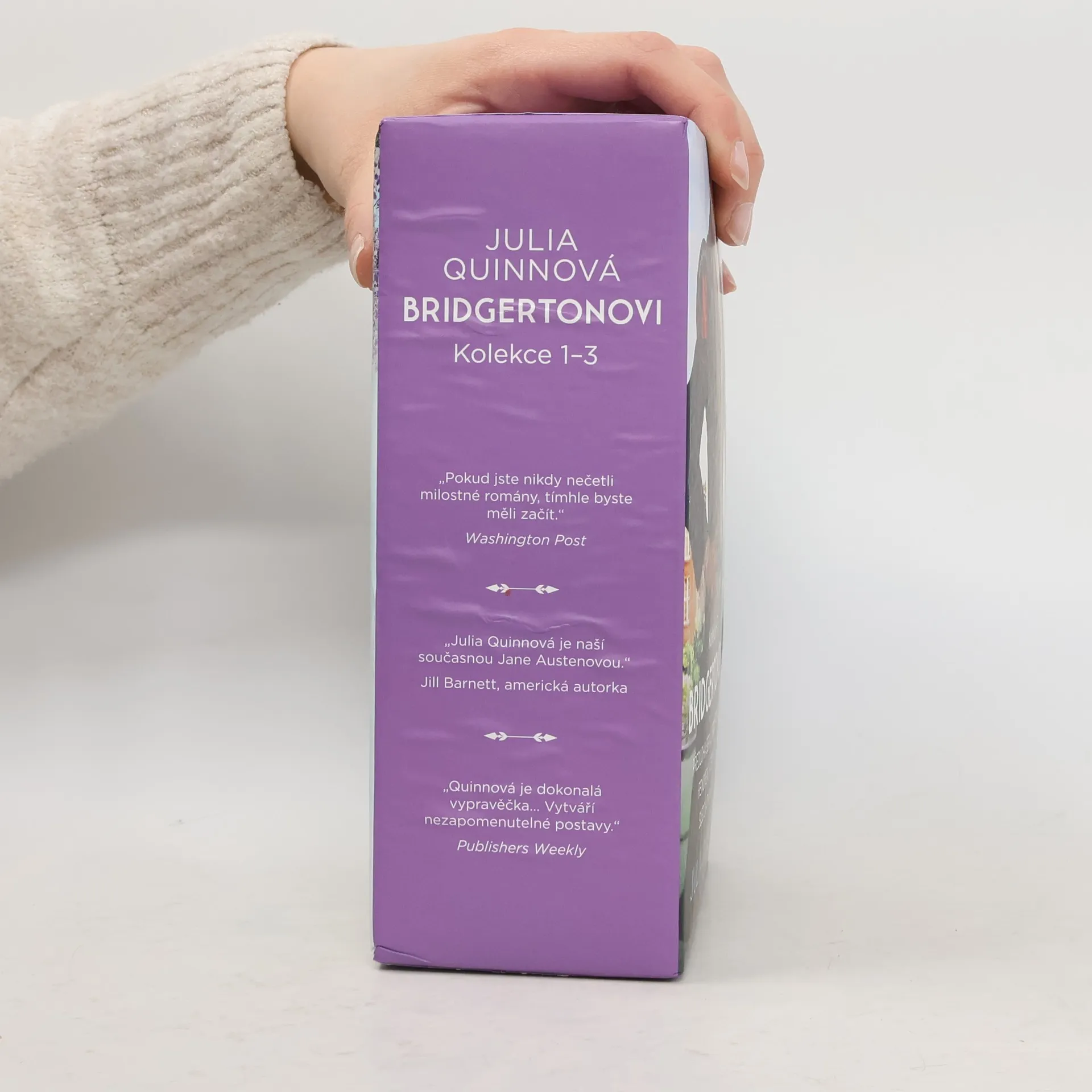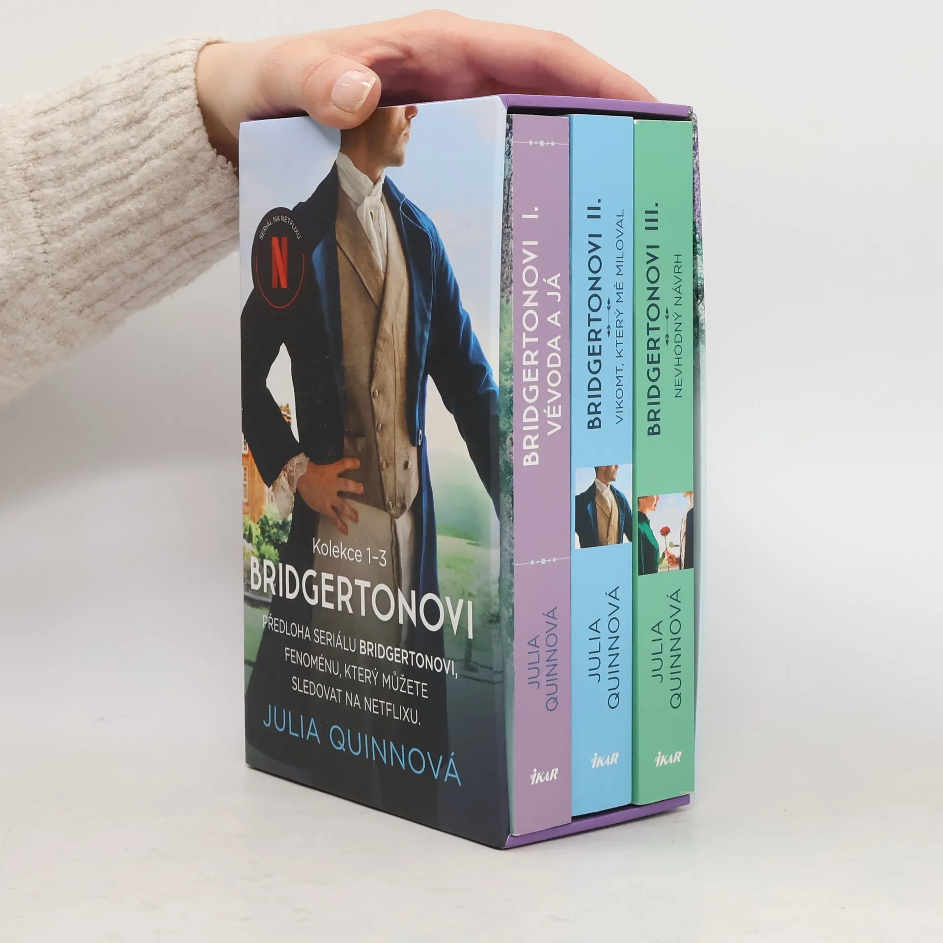 Přeneste se s tímto nápaditým boxem do tanečních sálů regentského Londýna. Čekají vás velmi svérázní aristokraté a nespočet zářivých plesů. Potkáte spoustu šarmantních mužů a troufalých žen, vyslechnete nekonečno klepů, a než se nadějete, stanete se obětí vychytralých intrikánek… V této sbírce na vás čekají první tři knihy – Vévoda a já; Vikomt, který mě miloval; Nevhodný návrh – celosvětově oblíbené série Bridgertonovi, jež se stala předlohou fenoménu, který můžete v současné době sledovat na Netflixu.