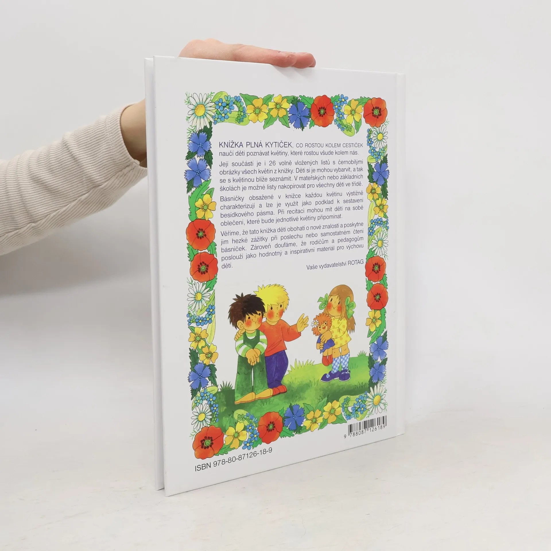 KNÍŽKA PLNÁ KYTIČEK, co rostou kolem cestiček naučí děti poznávat květiny, které rostou všude kolem nás. Obsahuje 26 nejznámějších kytiček, které tvoří vždy s příslušnou básničkou dvojstránku v knížce. Součástí knížky jsou i černobílé obrázky všech květin na volných listech, vložených do nalepených kapes na přední i zadní straně vnitřní obálky. Děti si je mohou vybarvit a tak se blíže s květinou seznámit. V mateřských nebo základních školách je možné listy nakopírovat pro všechny děti ve třídě.