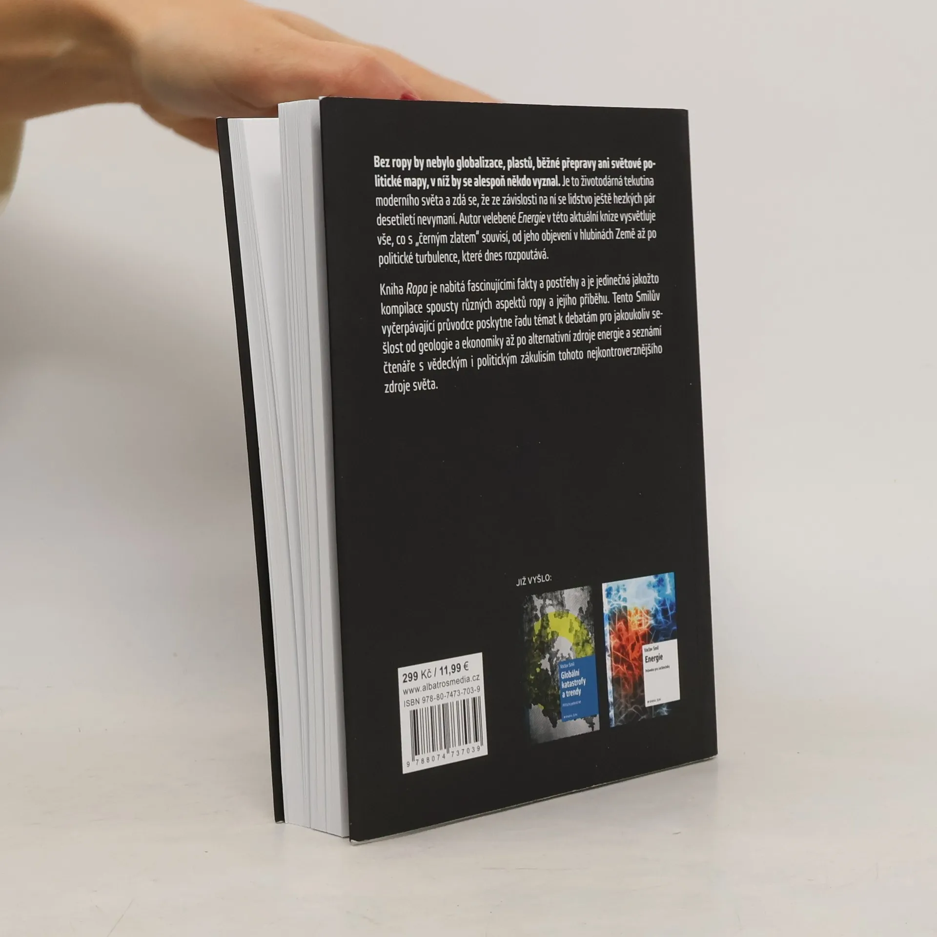 Bez ropy by nebylo globalizace, plastů, běžné přepravy ani světové politické mapy, v níž by se alespoň někdo vyznal. Je to životadárná tekutina moderního světa a zdá se, že ze závislosti na ní se lidstvo ještě hezkých pár desetiletí nevymaní. Autor uznávané Energie v této aktuální knize vysvětluje vše, co s „černým zlatem“ souvisí, od jeho objevení v hlubinách Země až po politické turbulence, které dnes rozpoutává. Kniha Ropa je nabitá fascinujícími fakty a postřehy a je jedinečná jakožto kompilace spousty různých aspektů ropy a jejího příběhu. Tento Smilův vyčerpávající průvodce poskytne řadu témat k debatám pro jakoukoliv sešlost od geologie a ekonomiky až po alternativní zdroje energie, a seznámí čtenáře s vědeckým i politickým zákulisím tohoto nejkontroverznějšího zdroje světa.