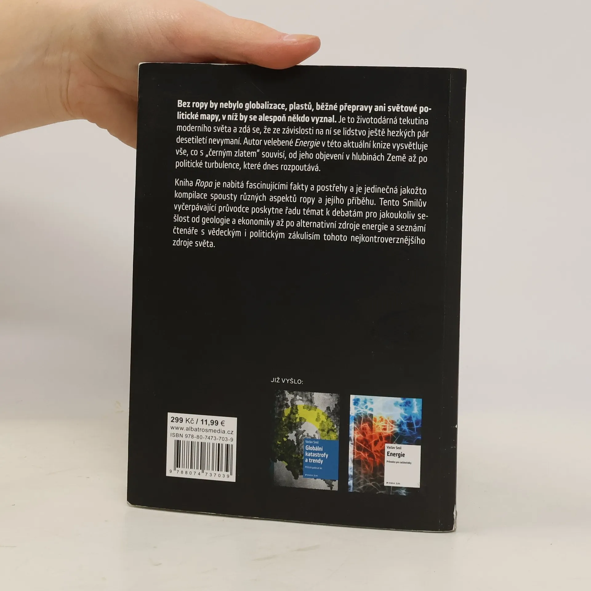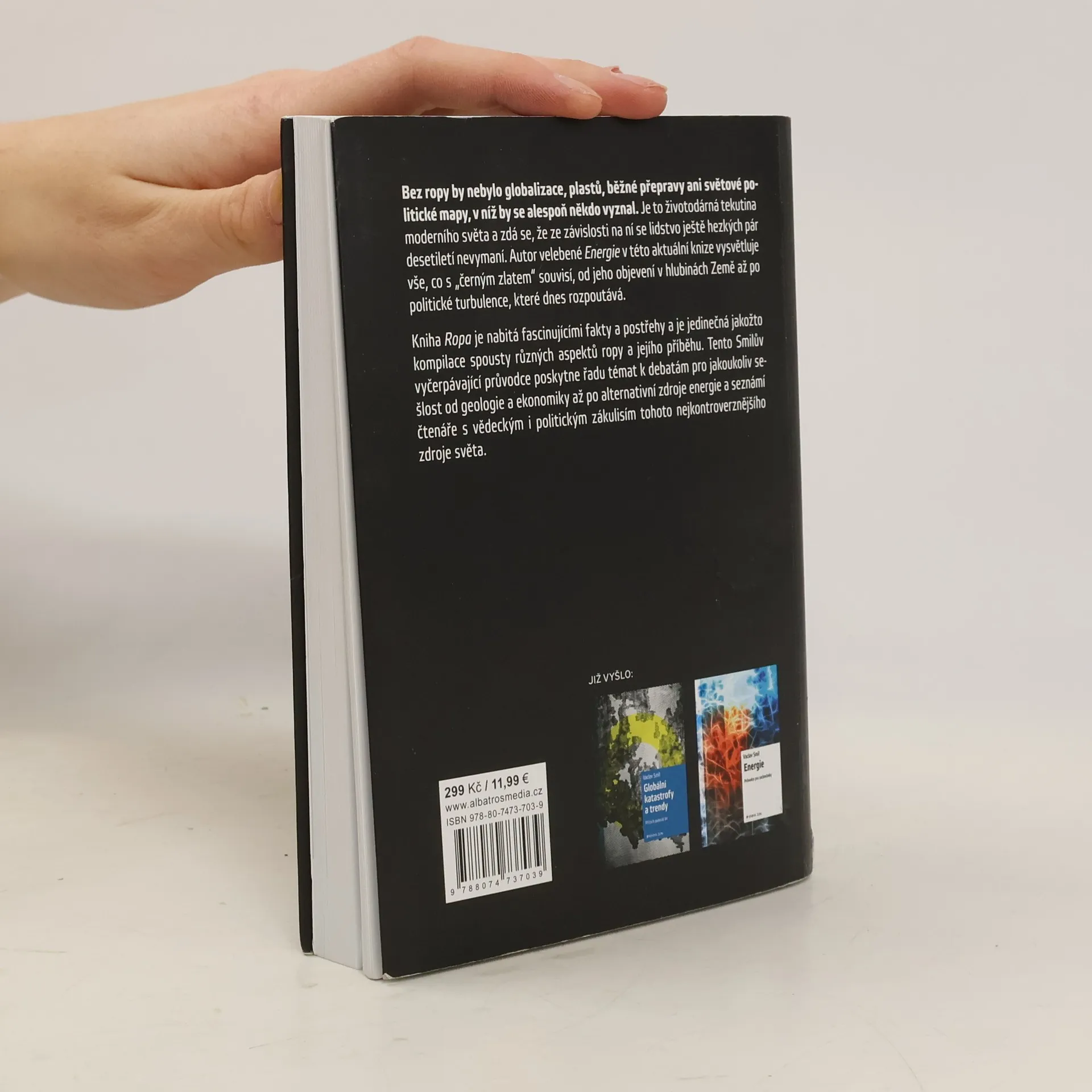 Bez ropy by nebylo globalizace, plastů, běžné přepravy ani světové politické mapy, v níž by se alespoň někdo vyznal. Je to životadárná tekutina moderního světa a zdá se, že ze závislosti na ní se lidstvo ještě hezkých pár desetiletí nevymaní. Autor uznávané Energie v této aktuální knize vysvětluje vše, co s „černým zlatem“ souvisí, od jeho objevení v hlubinách Země až po politické turbulence, které dnes rozpoutává. Kniha Ropa je nabitá fascinujícími fakty a postřehy a je jedinečná jakožto kompilace spousty různých aspektů ropy a jejího příběhu. Tento Smilův vyčerpávající průvodce poskytne řadu témat k debatám pro jakoukoliv sešlost od geologie a ekonomiky až po alternativní zdroje energie, a seznámí čtenáře s vědeckým i politickým zákulisím tohoto nejkontroverznějšího zdroje světa.