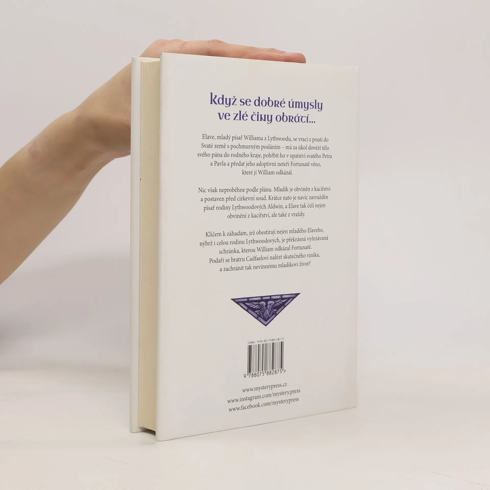 KDYŽ SE DOBRÉ ÚMYSLY VE ZLÉ ČINY OBRÁTÍ… Elave, mladý písař Williama z Lythwoodu, se vrací z pouti do Svaté země s pochmurným posláním – má za úkol dovézt tělo svého pána do rodného kraje, pohřbít ho v opatství svatého Petra a Pavla a předat jeho adoptivní neteři Fortunatě věno, které jí William odkázal. Nic však neproběhne podle plánu. Mladík je obviněn z kacířství a postaven před církevní soud. Krátce nato je navíc zavražděn písař rodiny Lythwoodových Aldwin, a Elave tak čelí nejen obvinění z kacířství, ale také z vraždy. Klíčem k záhadám, jež obestírají nejen mladého Elaveho, nýbrž i celou rodinu Lythwoodových, je překrásná vyřezávaná schránka, kterou William odkázal Fortunatě. Podaří se bratru Cadfaelovi nalézt skutečného viníka, a zachránit tak nevinnému mladíkovi život?