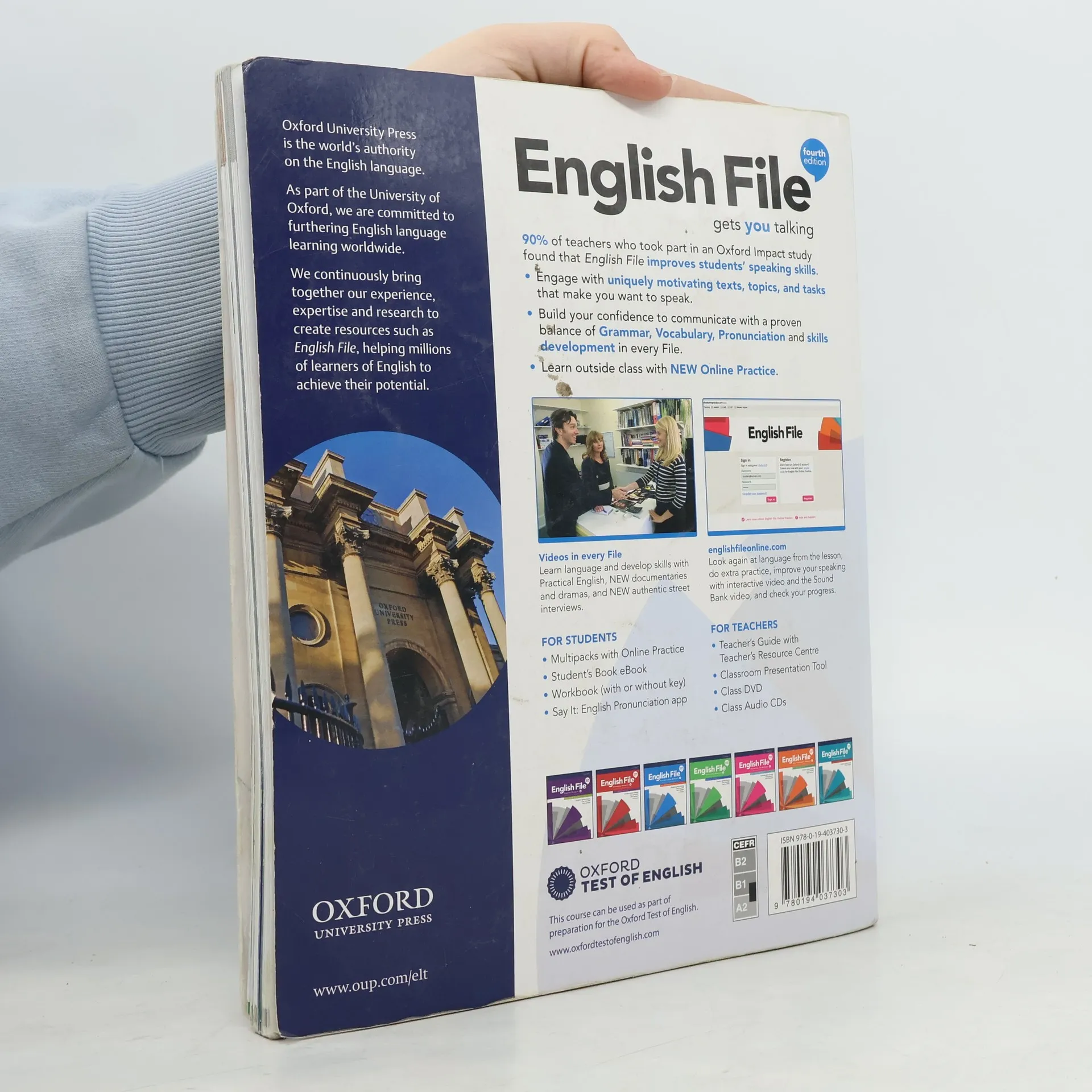 English File's unique, lively and enjoyable lessons are renowned for getting students talking.English File fourth edition has built on tried and trusted methodology and contains uniquely motivating lessons and activities that encourage students to discuss topics with confidence.The English File fourth edition Student's Book is packed full of interesting content to keep students of all abilities fully engaged and motivated.The English File fourth edition Workbook reinforces what is learned in each English File lesson, and can be used as extra practice during class, or set as homework.This set is for students at a Pre-intermediate (A2–B1) level of English