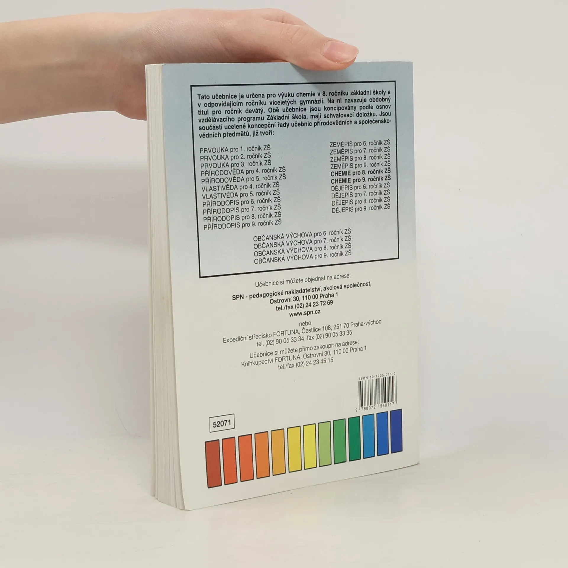 Dvoudílná řada učebnic chemie pro 8. a 9. ročník ZŠ. Pro každý ročník je připravena jedna barevná učebnice formátu A5 doplněná pracovním sešitem. Učitelům je k dispozici jedna společná metodická příručka. Učebnice i pracovní sešity mají schvalovací doložku MŠMT ČR. Dotisk v r. 2000. Formát A5, 144 stran