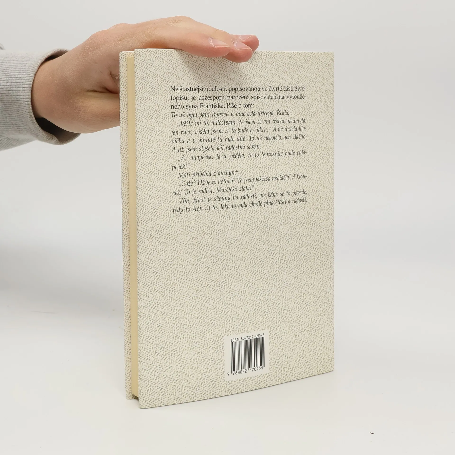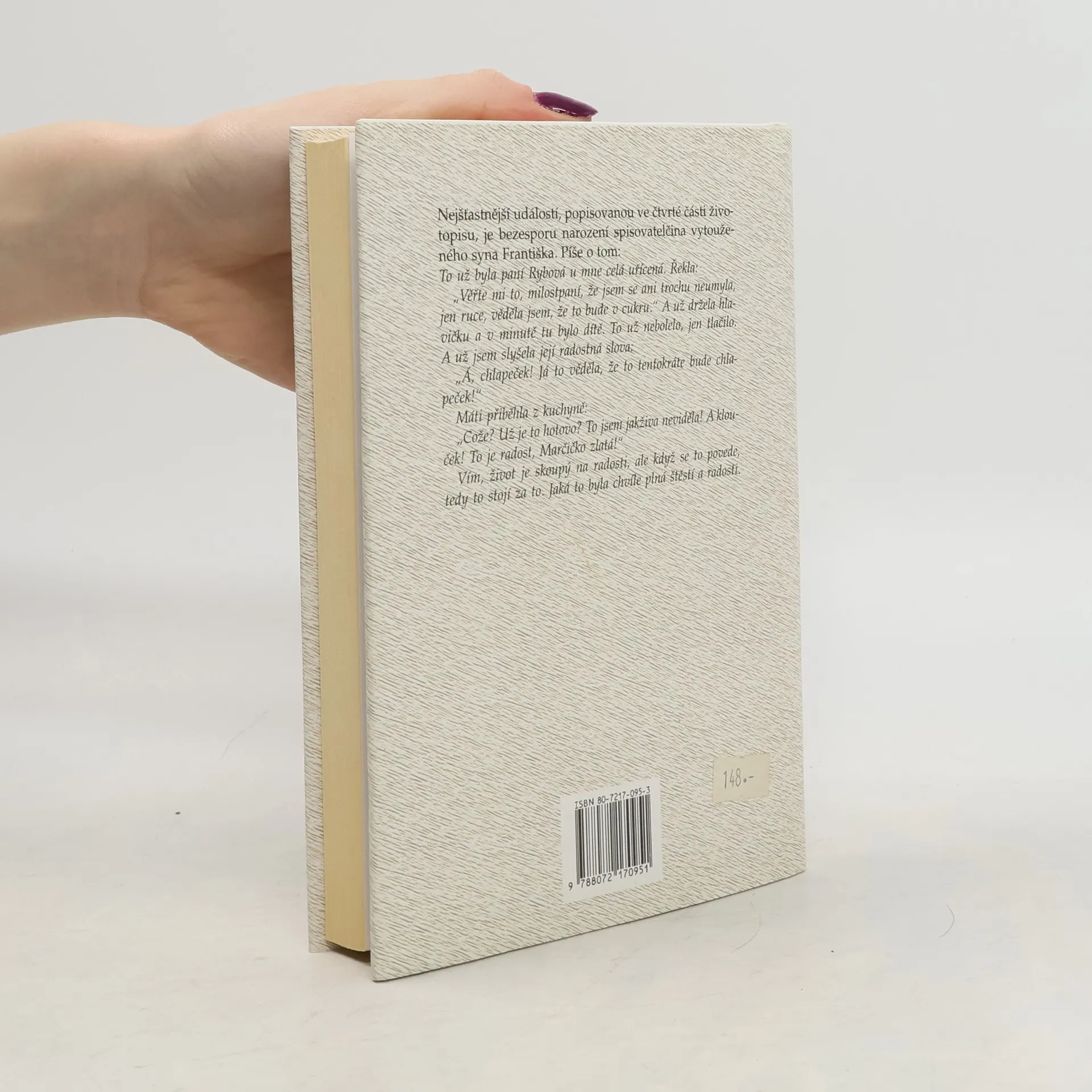 Nejšťastnější událostí, popisovanou ve čtvrté části životopisu, je bezesporu narození spisovatelčina vytouženého syna Františka. Píše o tom: To už byla paní Rybová u mne celá uřícená. Řekla: "Věřte mi to, milostpaní, že jsem se ani trochu neumyla, jen ruce, věděla jsem, že to bude v cukru." A už držela hlavičku a v minutě tu bylo dítě. To už nebolelo, jen tlačilo. A už jsem slyšela její radostná slova: "Á, chlapeček! Já to věděla, že to tentokráte bude chlapeček!" Máti přiběhla z kuchyně: "Cože? Už je hotovo? To jsem jakživa neviděla" A klouček! To je radost, Marčičko zlatá!? Vím, život je skoupý na radosti, ale když se to povede, tedy to stojí za to. Jaká to byla chvíle plná štěstí a radosti.