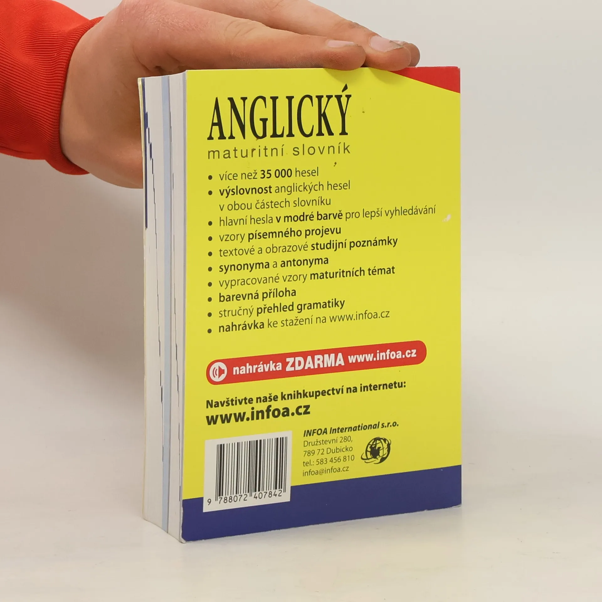 Slovník obsahuje více než 35 000 hesel, výslovnost anglických hesel v obou částech slovníku, hlavní hesla v modré barvě pro lepší vyhledávání, vzory písemného projevu, textové a obrazové studijní poznámky, synonyma a antonyma, vypracované vzory maturitních témat, stručný přehled gramatiky, konverzace.