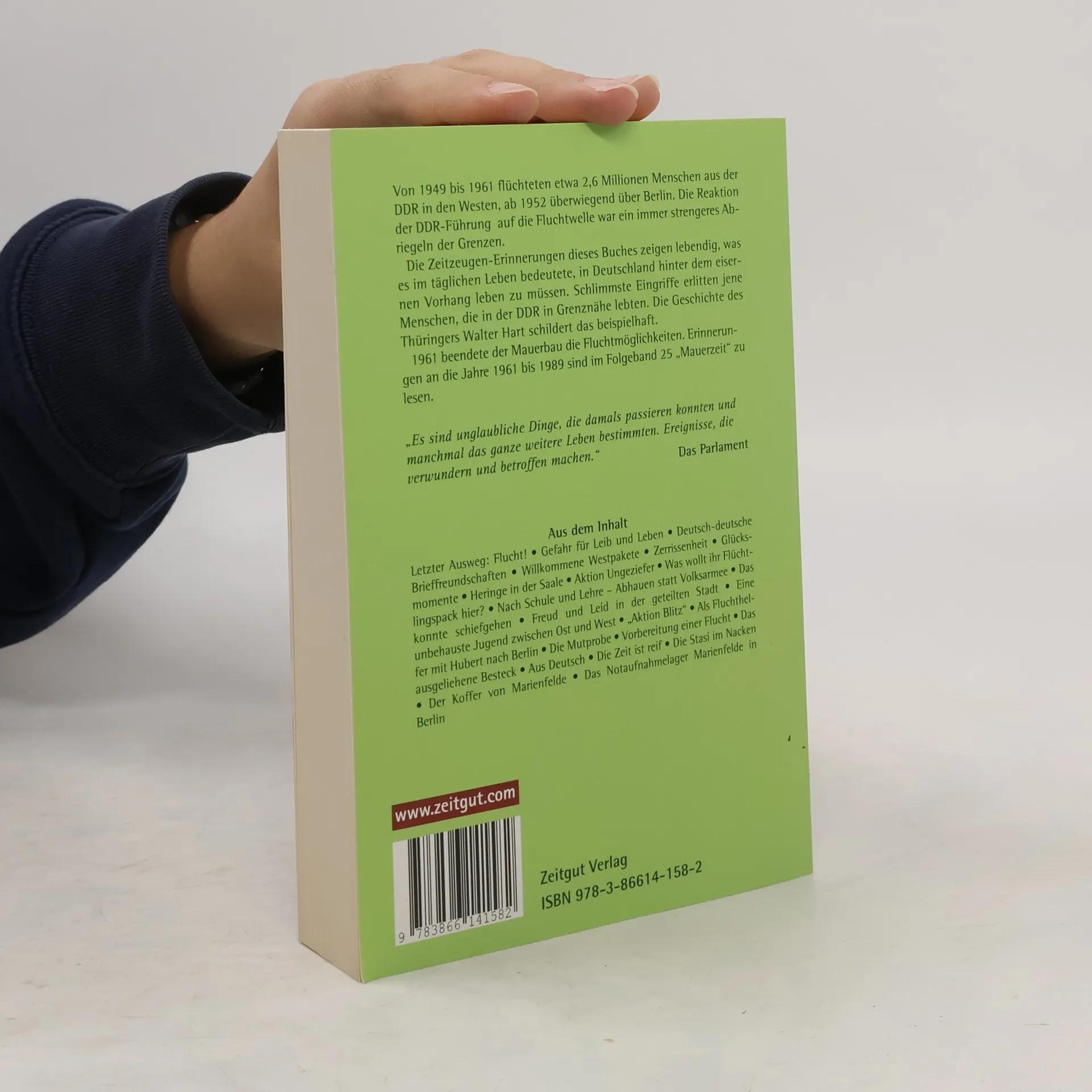 Von 1949 bis 1961 flüchteten etwa 2,6 Millionen Menschen aus der DDR in den Westen, ab 1952 überwiegend über Berlin. Die Reaktion der DDR-Führung auf die Fluchtwelle war ein immer strengeres Abriegeln der Grenzen.§Die Zeitzeugen- Erinnerungen dieses Buches zeigen lebendig, was es im täglichen Leben bedeutete, in Deutschland hinter dem eisernen Vorhang leben zu müssen. Schlimmste Eingriffe erlitten jene Menschen, die in der DDR in Grenznähe lebten. Die Geschichte des Thüringers Walter Hart schildert das beispielhaft. 'Letzter Ausweg: Flucht' heißt ein anderer Beitrag.§1961 beendete der Mauerbau die Fluchtmöglichkeit. Die Erinnerungen an die Jahre 1961 bis 1989 sind im Folgeband 25 'Mauerzeit' zu lesen.