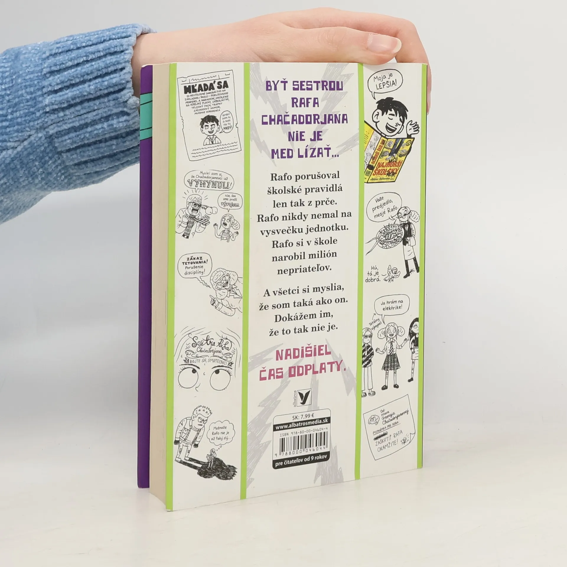 Volám sa Georgia Chačadorjanová a viem, čo vám o mne narozprával môj brat Rafo. Lži, samé lži! Tvrdí, že som otravná, mám podrezaný jazyk a kradnem pudingy. Dobre, to posledné je možno trochu pravda. Lenže to je len časť pravdy. Som totiž aj bystrejšia než on, obľúbenejšia než on a je so mnou väčšia zábava. Pripravte sa teda na pravdivý príbeh o tom, ako jeden príšerný brat a jeho ešte horšia povesť zničili jednej úplne nevinnej babe život a celý prvý ročník na druhom stupni základnej školy. Prišiel čas vyrovnať si účty!