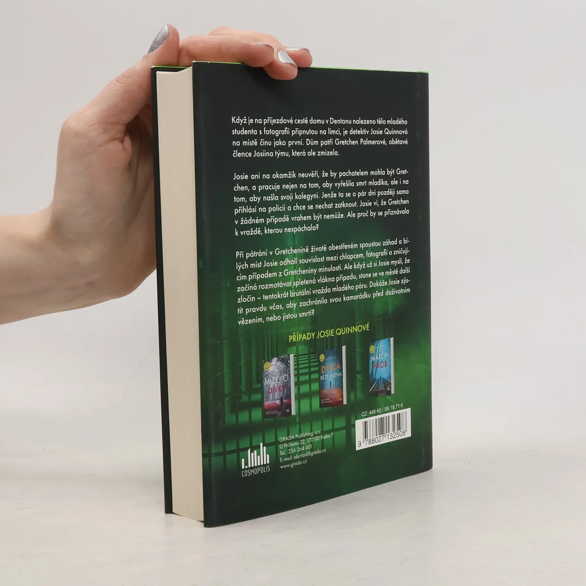 Když je na příjezdové cestě domu v Dentonu nalezeno tělo mladého studenta s fotografií připnutou na límci, je detektiv Josie Quinnová na místě činu jako první. Dům patří Gretchen Palmerové, obětavé člence Josiina týmu, která ale zmizela. Josie ani na okamžik neuvěří, že by pachatelem mohla být Gretchen, a pracuje nejen na tom, aby vyřešila smrt mladíka, ale i na tom, aby našla svoji kolegyni. Jenže ta se o pár dní později sama přihlásí na policii a chce se nechat zatknout. Josie ví, že Gretchen v žádném případě vrahem být nemůže. Ale proč by se přiznávala k vraždě, kterou nespáchala? Při pátrání v Gretchenině životě obestřeném spoustou záhad a bílých míst Josie odhalí souvislost mezi chlapcem, fotografií a zničujícím případem z Gretcheniny minulosti. Ale když už si Josie myslí, že začíná rozmotávat spletená vlákna případu, stane se ve městě další zločin – tentokrát brutální vražda mladého páru. Dokáže Josie zjistit pravdu včas, aby zachránila svou kamarádku před doživotním vězením, nebo jistou smrtí?