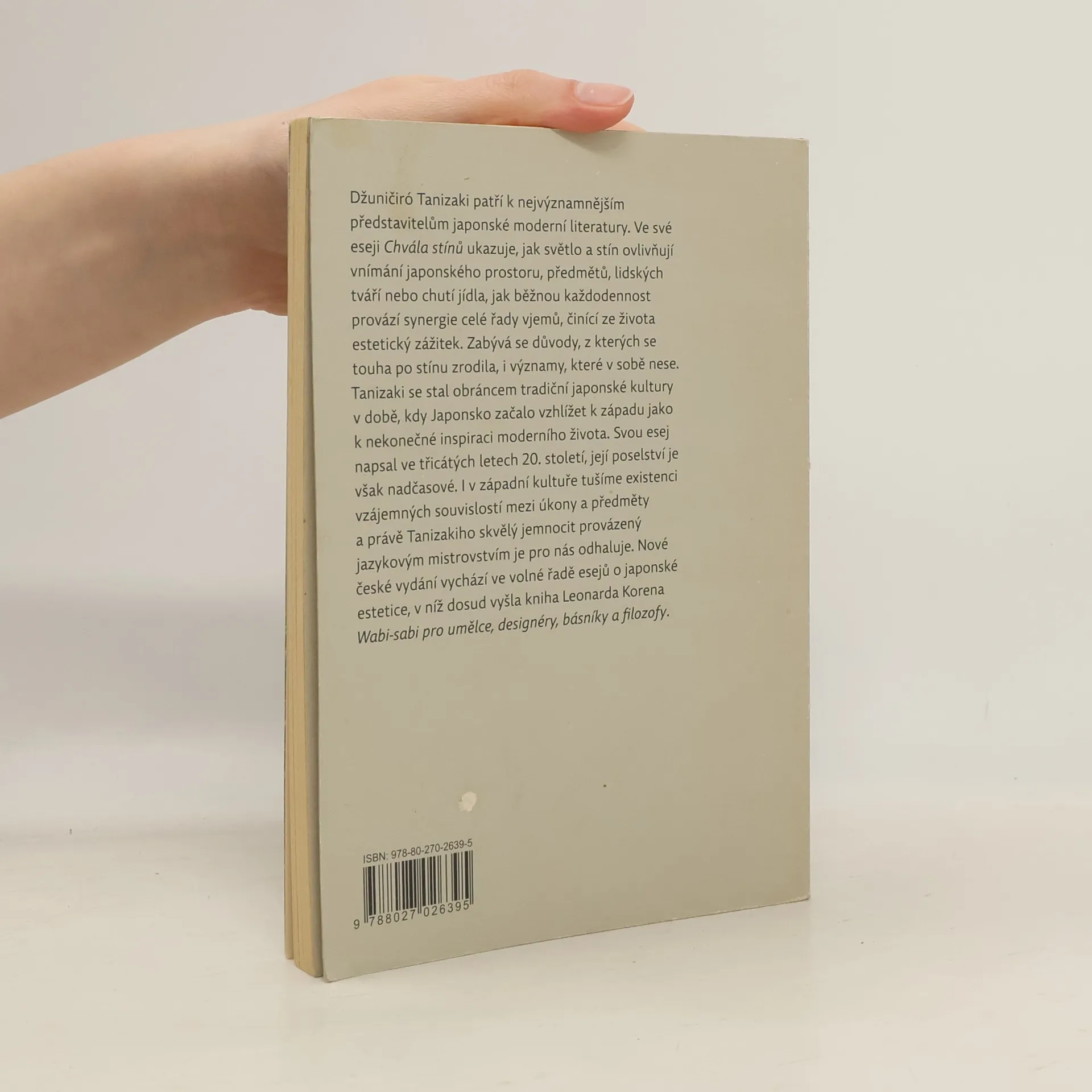 Džuničiró Tanizaki patří k nejvýznamnějším představitelům japonské moderní literatury. Ve své eseji Chvála stínů ukazuje, jak světlo a stín ovlivňují vnímání japonského prostoru, předmětů, lidských tváří nebo chutí jídla, jak běžnou každodennost provází synergie celé řady vjemů, činící ze života estetický zážitek. Zabývá se důvody, z kterých se touha po stínu zrodila, i významy, které v sobě nese. Tanizaki se stal obráncem tradiční japonské kultury v době, kdy Japonsko začalo vzhlížet k západu jako k nekonečné inspiraci moderního života. Svou esej napsal ve třicátých letech 20. století, její poselství je však nadčasové. I v západní kultuře tušíme existenci vzájemných souvislostí mezi úkony a předměty a právě Tanizakiho skvělý jemnocit provázený jazykovým mistrovstvím je pro nás odhaluje. Nové české vydání vychází ve volné řadě esejů o japonské estetice, v níž dosud vyšla kniha Leonarda Korena Wabi-sabi pro umělce, designéry, básníky a filozofy.