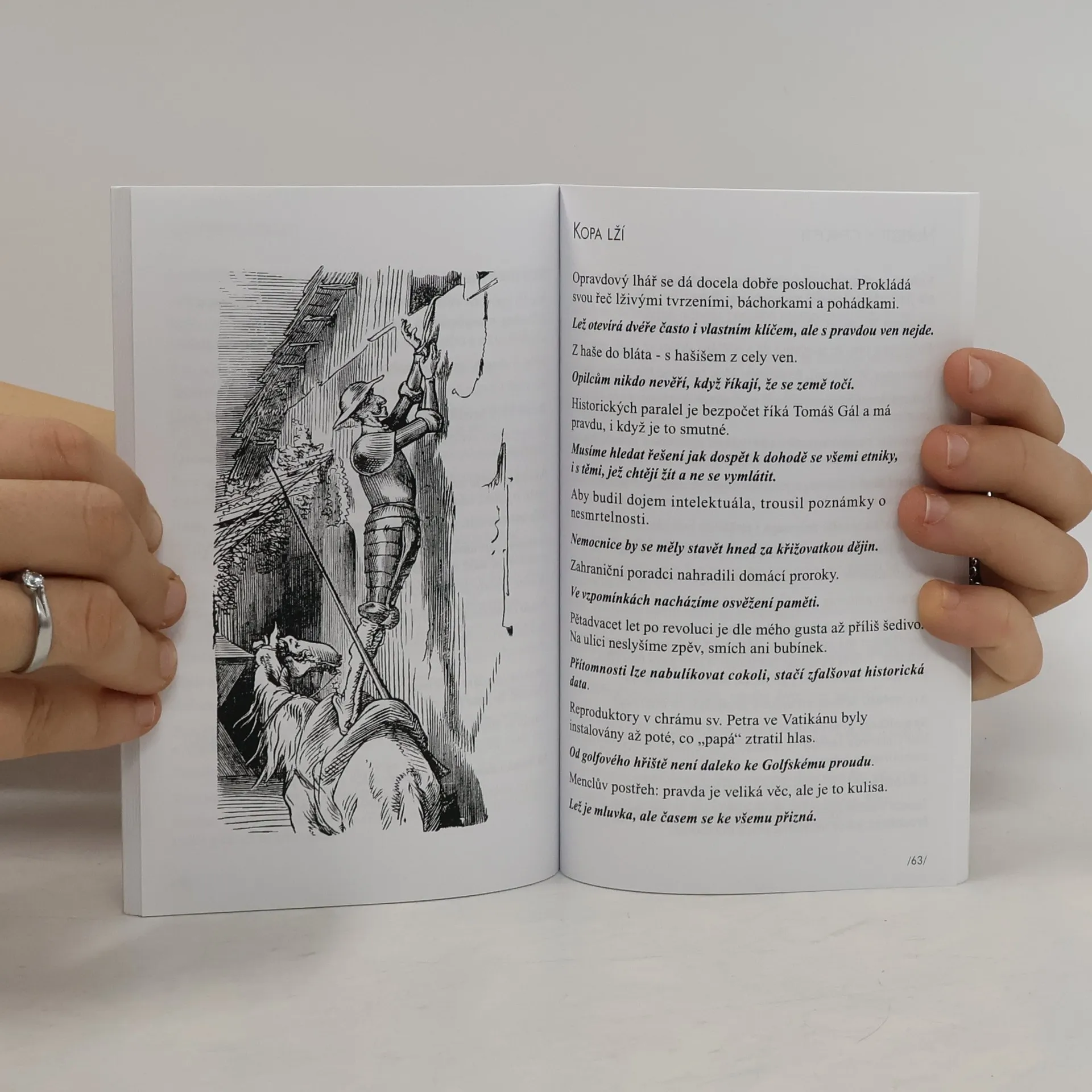 Známý autor mnoha knih aforismů nám v této kapesní knížce nabízí čerstvé sentence především z tvorby dvou posledních let. Sbírku doplnil o výběr svých aforismů z přelomu tisíciletí, a také prozaickými texty zaměřenými na divadlo a humor. Nicméně v knížce najdeme také další témata např. o spravedlnosti, politice, lakomství, času, a světe div se, také o poctivosti. Literární žánr aforismu, jenž se vyznačuje lapidární zkratkou, je sice blízký prozaické tvorbě, ale autor se nevyhýbá ani poetické formě zastoupené zde aforismu blízkými útvary: metaforou, paradoxem a gregérií.