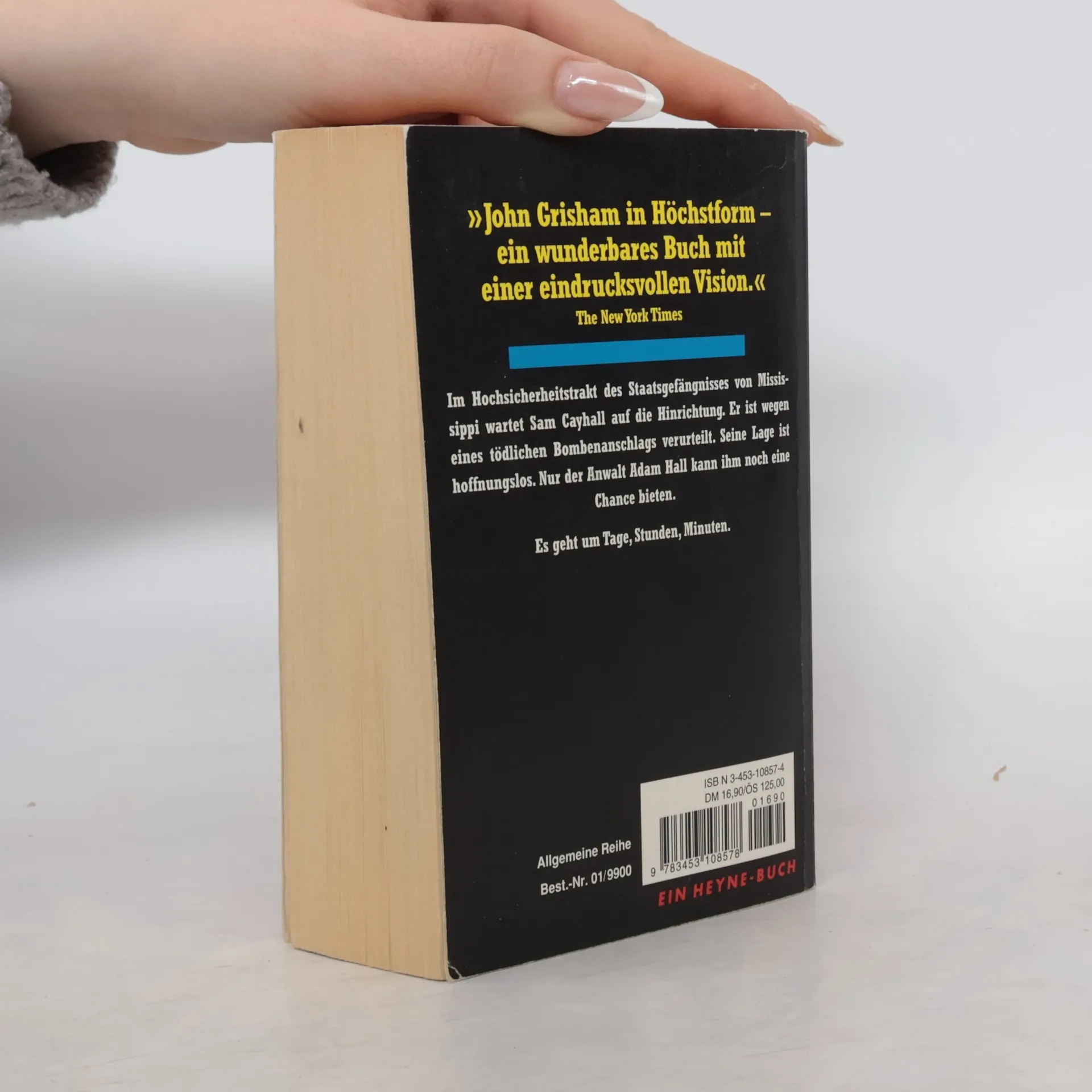 "John Grisham in Höchstform." The New York Times Im Hochsicherheitstrakt des Staatsgefängnisses von Mississippi wartet Sam Cayhall auf seine Hinrichtung. Er ist wegen eines tödlichen Bombenanschlags verurteilt. Seine Lage ist hoffnungslos. Nur der Anwalt Adam Hall kann ihm noch eine Chance bieten. Es geht um Tage, Stunden, Minuten.