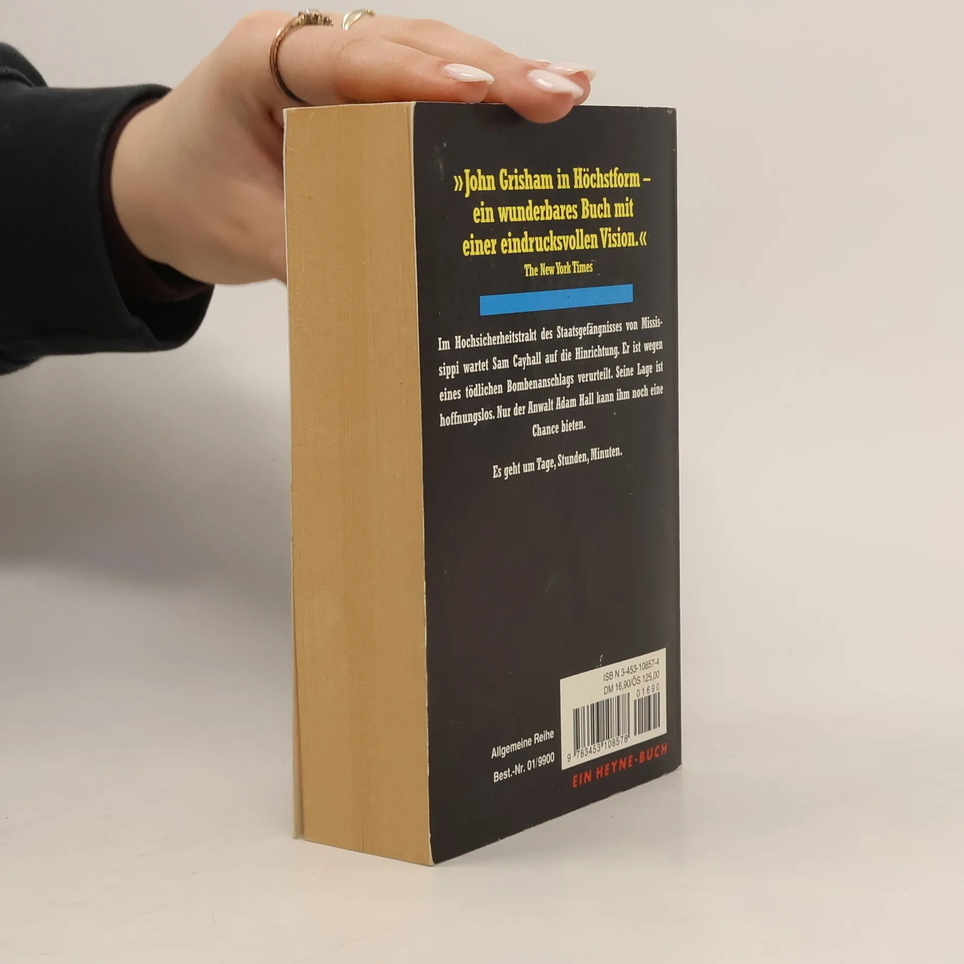 "John Grisham in Höchstform." The New York Times Im Hochsicherheitstrakt des Staatsgefängnisses von Mississippi wartet Sam Cayhall auf seine Hinrichtung. Er ist wegen eines tödlichen Bombenanschlags verurteilt. Seine Lage ist hoffnungslos. Nur der Anwalt Adam Hall kann ihm noch eine Chance bieten. Es geht um Tage, Stunden, Minuten.