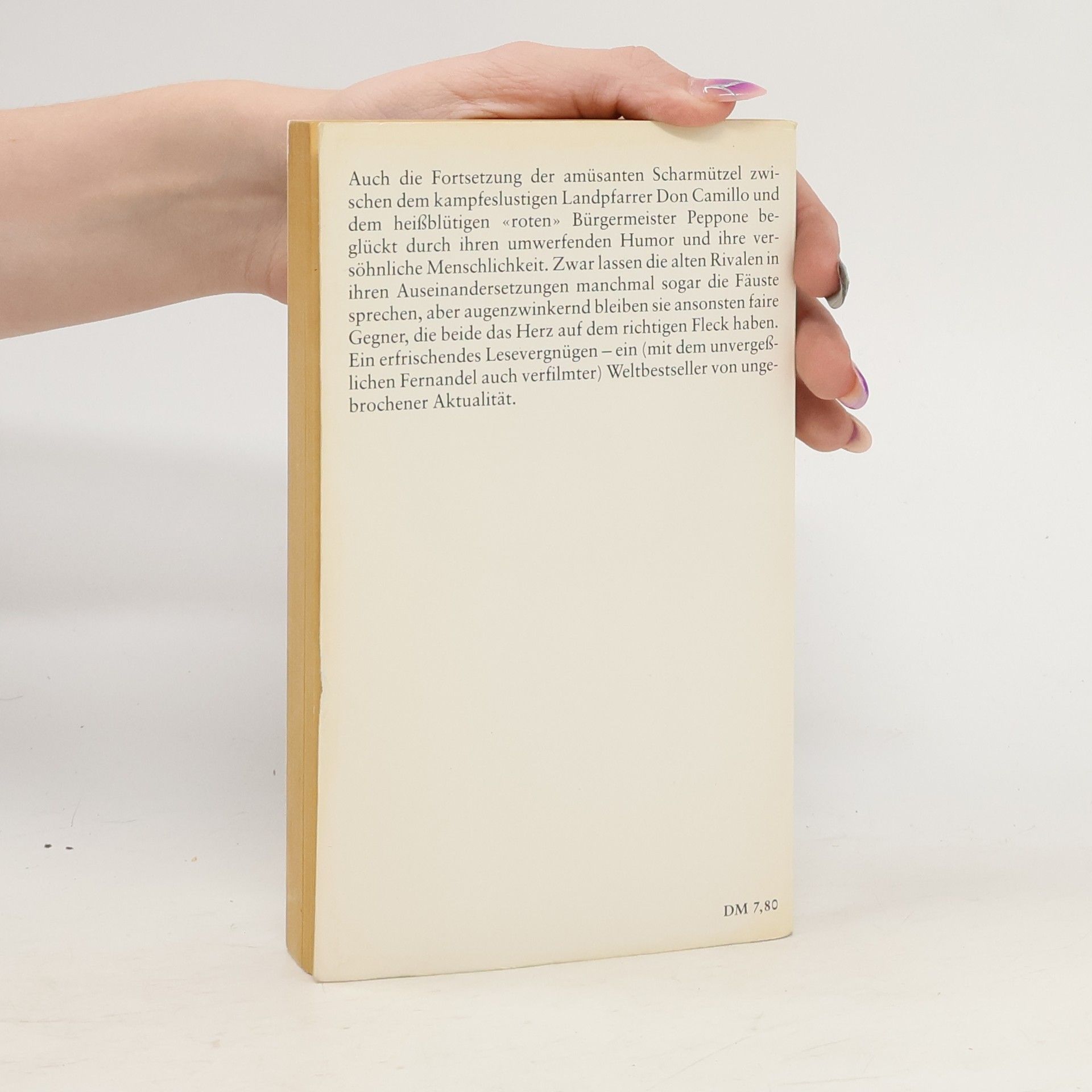 Kein Wunder, daß dieser (mit dem unvergeßlichen Fernandel verfilmte) Roman eines der erfolgreichsten Bücher unserer Zeit wurde. In einer Epoche unmenschlicher Kämpfe zwischen den Ideologien versöhnen die pointenknisternden Erlebnisse eines rauflustigen Landpfarrers und seines hitzköpfigen politischen Rivalen durch ihre verblüffende Komik und verschmitzte Lebensklugheit. Die politischen Konflikte im heutigen Italien bezeugen erneut die zeitlose Aktualität dieses Bestsellers der Weltliteratur.