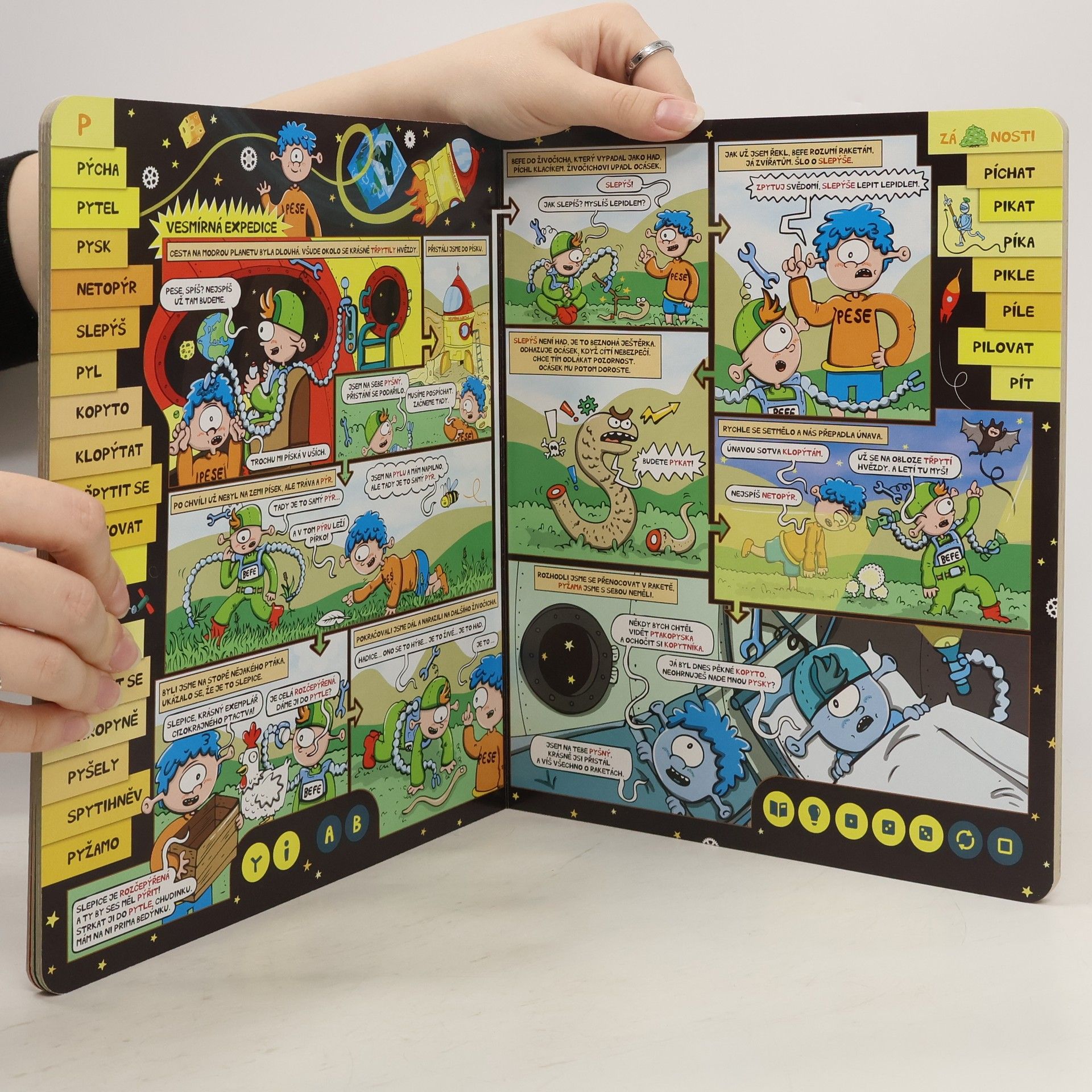 Knížka pro použití s elektronickou "mluvící" tužkou seznámí děti s vyjmenovanými slovy.Kniha je zaměřená na úkoly a procvičování. Nechybí ani význam jednotlivých slov, nejběžnější příbuzná slova a uvedení pravopisně výjimečných slov.