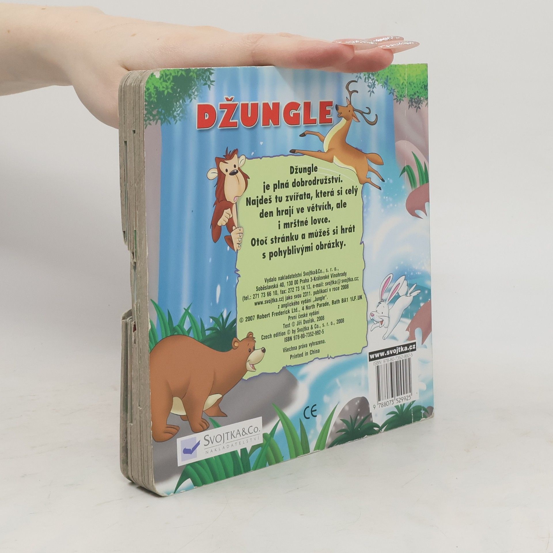 Džungle je plná dobrodružství. Najdeš tu zvířata, která si celý den hrají ve větvích, ale i mrštné lovce. Otoč stránku a můžeš si hrát s pohyblivými obrázky. Kniha je doplněna verši a půvabnými ilustracemi .