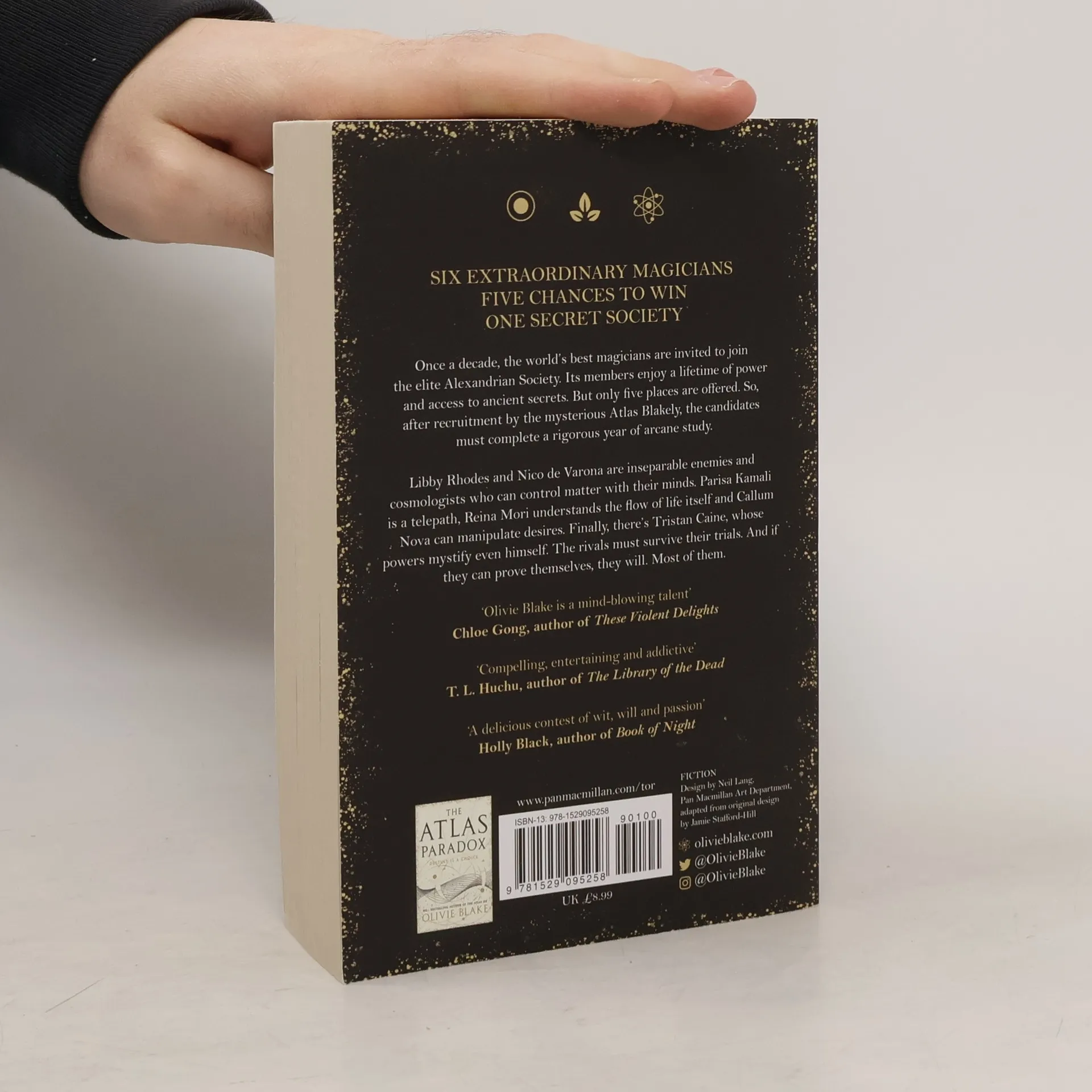 Secrets. Betrayal. Seduction.Welcome to the Alexandrian Society.When the world's best magicians are offered an extraordinary opportunity, saying yes is easy. Each could join the secretive Alexandrian Society, whose custodians guard lost knowledge from ancient civilizations. Their members enjoy a lifetime of power and prestige. Yet each decade, only six practitioners are invited - to fill five places.Contenders Libby Rhodes and Nico de Varona are inseparable enemies, cosmologists who can control matter with their minds. Parisa Kamali is a telepath, who sees the mind's deepest secrets. Reina Mori is a naturalist who can perceive and understand the flow of life itself. And Callum Nova is an empath, who can manipulate the desires of others. Finally there's Tristan Caine, whose powers mystify even himself.Following recruitment by the mysterious Atlas Blakely, they travel to the Society's London headquarters. Here, each must study and innovate within esoteric subject areas. And if they can prove themselves, over the course of a year, they'll survive. Most of them.The story continues in The Atlas Paradox, the heart-stopping sequel