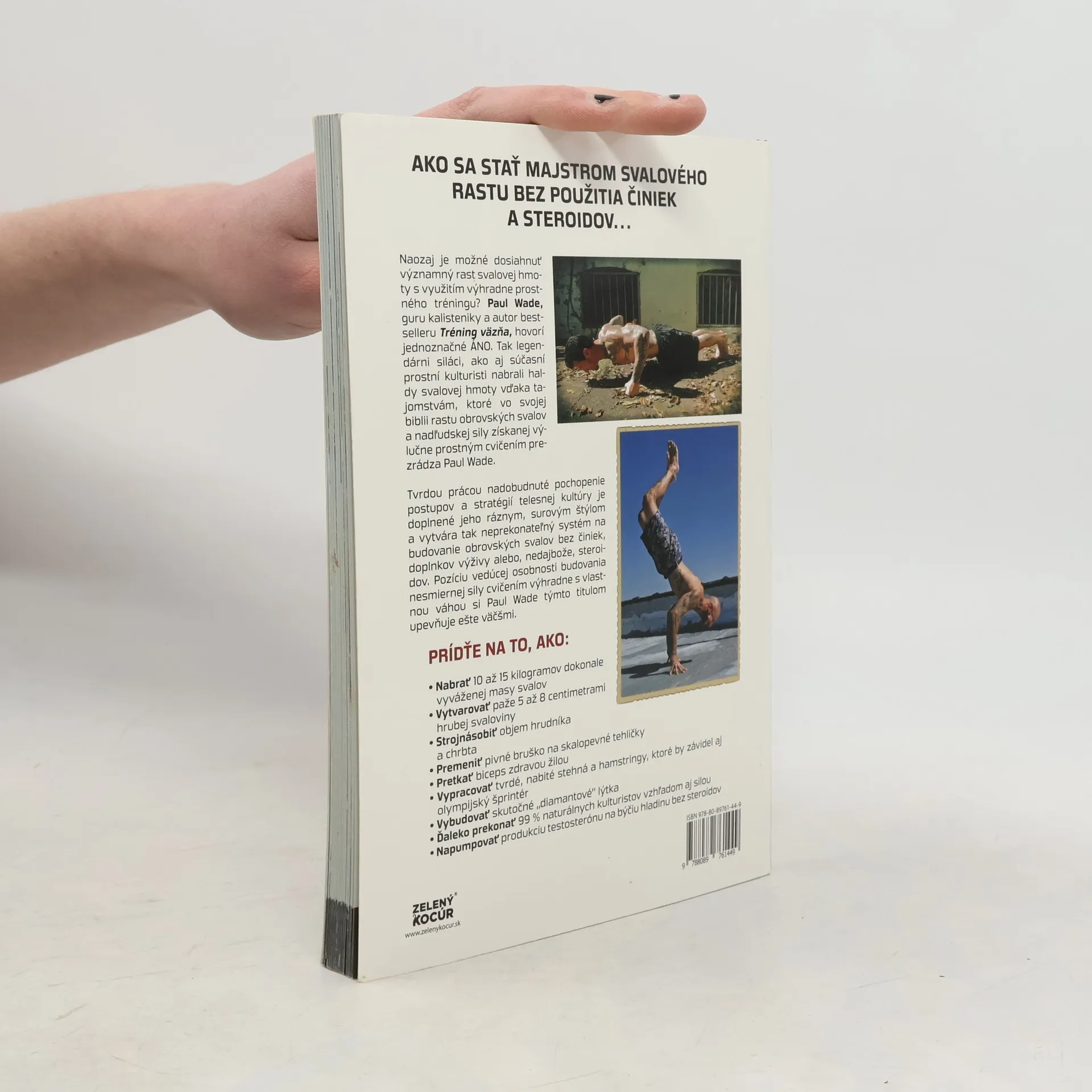 AKO SA STAŤ MAJSTROM SVALOVÉHO RASTU BEZ POUŽITIA ČINIEK A STEROIDOV… Je naozaj možné dosiahnuť významný rast svalovej hmoty s využitím výhradne prostného tréningu? Paul Wade, guru kalisteniky a autor bestselleru Tréning väzňa, hovorí jednoznačné Áno. Tak legendárni siláci, ako aj súčasní prostní kulturisti nabrali haldy svalovej hmoty vďaka tajomstvám, ktoré vo svojej biblii rastu obrovských svalov a nadľudskej sily nadobudnutej výlučne prostným cvičením prezrádza Paul Wade. Tvrdou prácou nadobudnuté pochopenie postupov a stratégií telesnej kultúry je doplnené jeho ráznym, surovým štýlom a vytvára tak neprekonateľný systém na budovanie obrovských svalov bez činiek, doplnkov výživy alebo, nedajbože, steroidov. svoju Pozíciu vedúcej osobnosti budovania nesmiernej sily cvičením výhradne s vlastnou váhou si Paul Wade týmto titulom upevňuje ešte väčšmi. PRÍDŤE NA TO, AKO: • Nabrať 10 až 15 kilogramov dokonale vyváženej masy svalov • Vytvarovať paže 5 až 8 centimetrami hrubej svaloviny • Strojnásobiť objem hrudníka a chrbta • Premeniť pivné bruško na skalopevné tehličky • Pretkať biceps zdravou žilou • Vypracovať tvrdé, nabité stehná a hamstringy, ktoré by závidel aj olympijský šprintér • Vybudovať skutočné „diamantové” lýtka • Ďaleko prekonať 99 % naturálnych kulturistov vzhľadom aj silou • Napumpovať produkciu testosterónu na býčiu hladinu bez steroidov.
