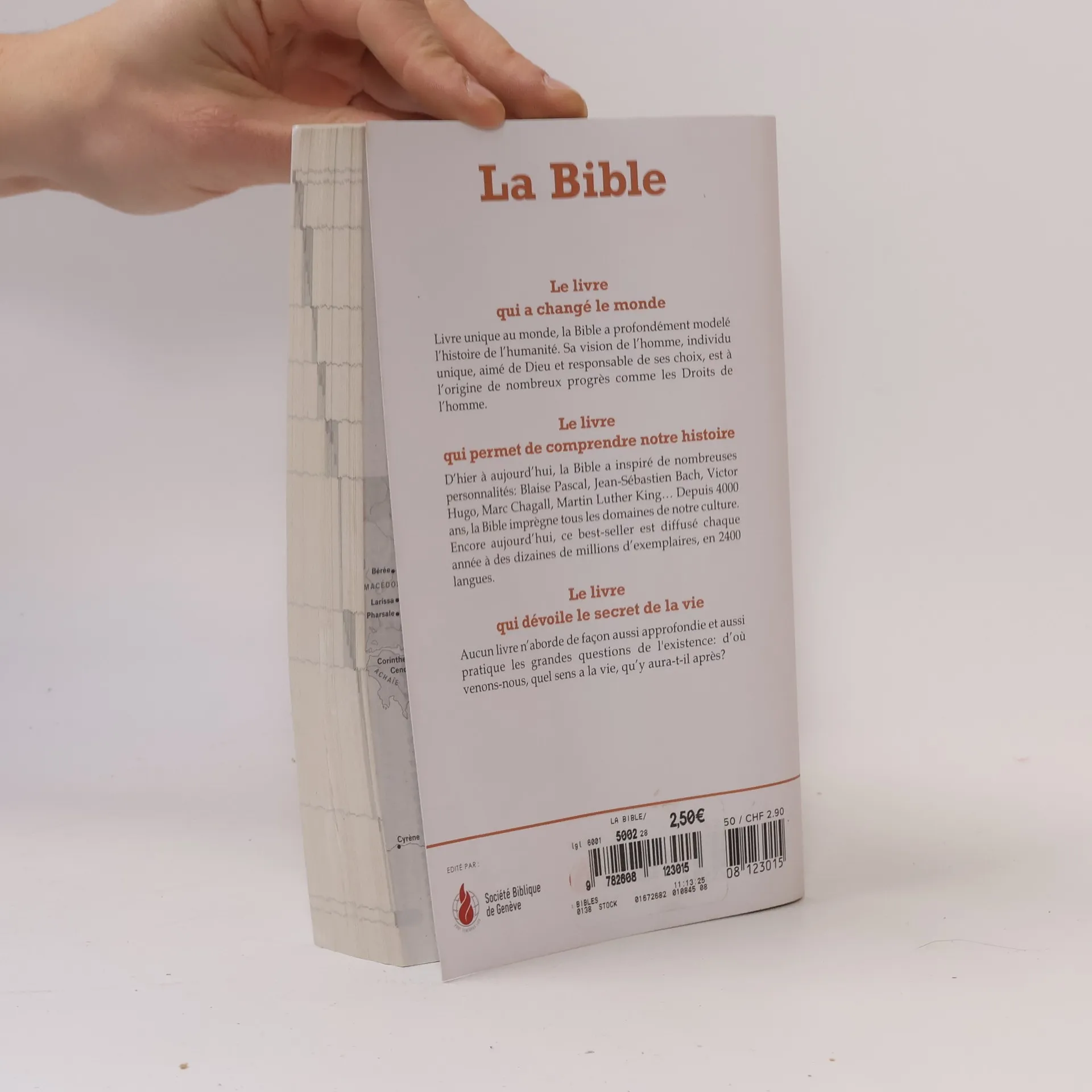 Le livre qui a changé le monde. Livre unique au monde, la Bible a profondément modelé l'histoire de l'humanité. Sa vision de l'homme, individu unique, aimé de Dieu et responsable de ses choix, est à l'origine de nombreux progrès comme les Droits de l'homme.Le livre qui permet de comprendre notre histoire.D'hier à aujourd'hui, la Bible a inspiré de nombreuses personnalités: Blaise Pascal, Jean-Sébastien Bach, Victor Hugo, Marc Chagall, Martin Luther King ... Depuis 4000 ans, la Bible imprègne tous les domaines de notre culture. Encore aujourd'hui, ce best-seller est diffusé chaque année à des dizaines de millions d'exemplaires, en 2400 langues. Le livre qui dévoile le secret de la vie.Aucun livre n'aborde de façon aussi approfondie et aussi pratique que les grandes questions de l'existence: d'où venons-nous, quel sens a la vie, qu'y aura-t-il après?