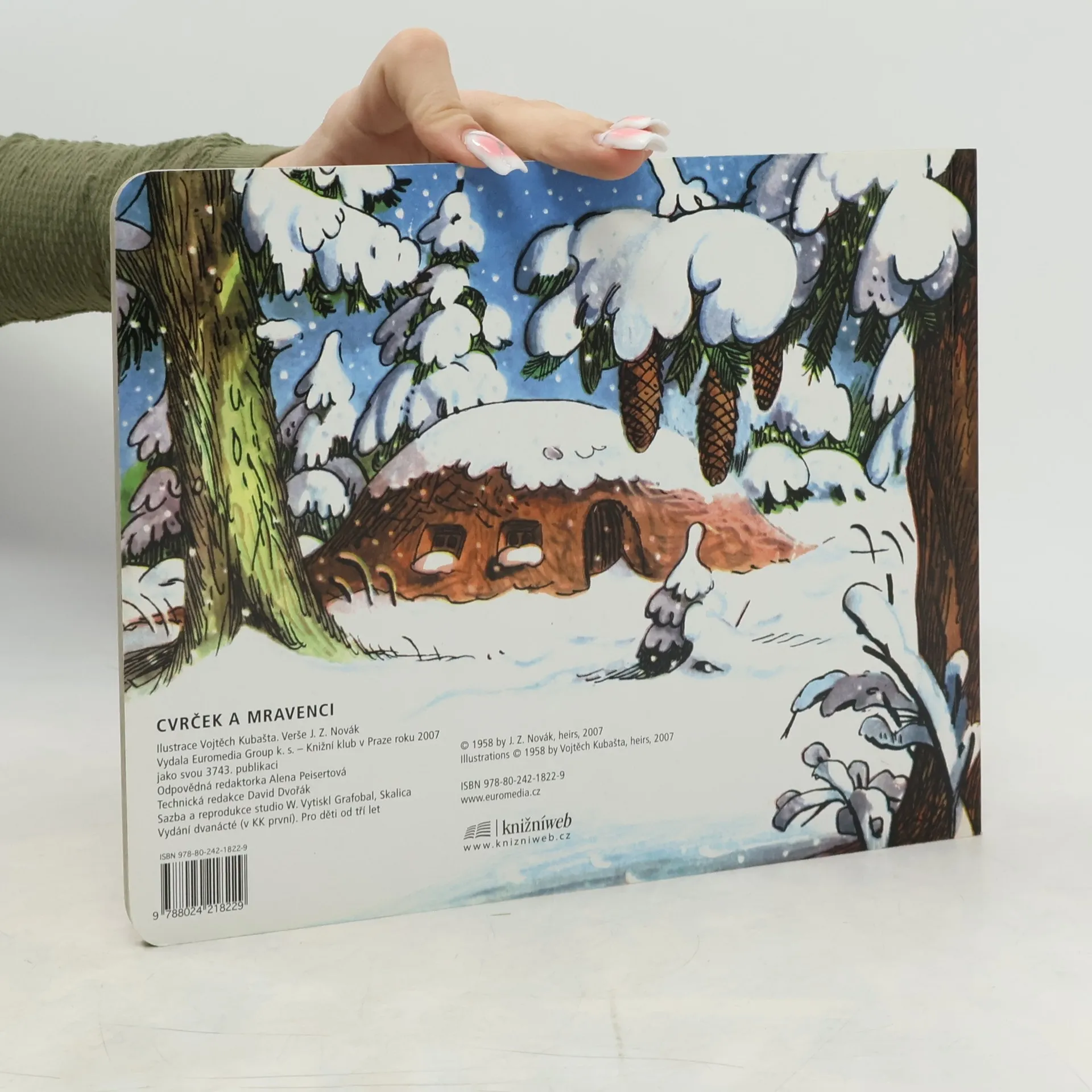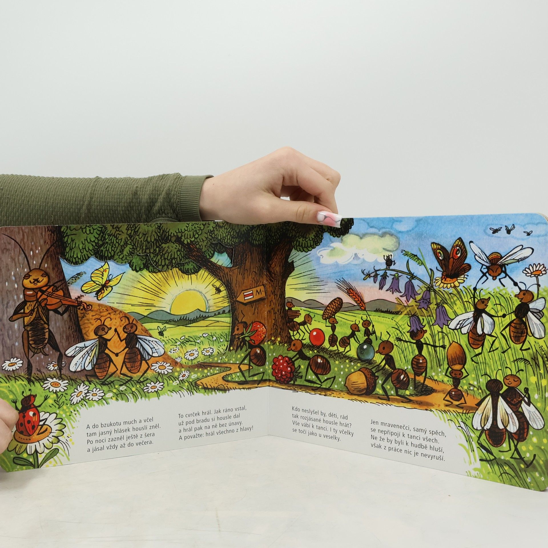 Leporelo s proseknutými otvory. Na příběhu veselého cvrčka a pracovitých mravenců si malí čtenáři uvědomí, že každý má v životě své místo, každý může být druhým prospěšný. Nejdůležitější je ovšem porozumění, soucit a nesobecké přátelství.