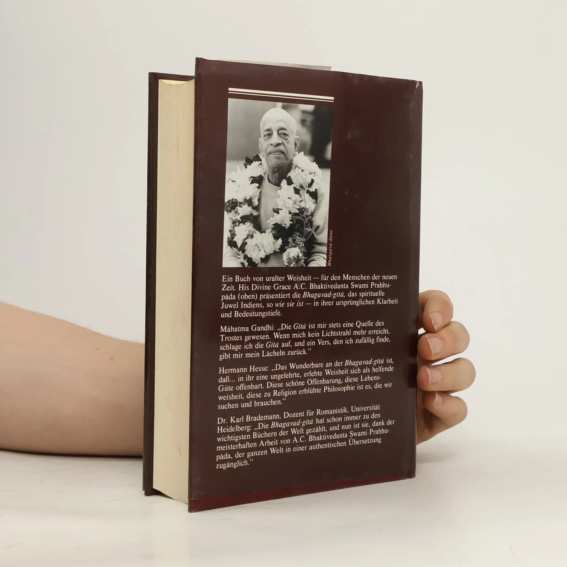 Die Bhagavad-gita (wörtlich: der «Gesang Gottes») ist der bedeutendste und bekannteste Klassiker der indischen Literatur. Sie bildet den Kern der gesamten vedischen Weisheit und enthält eine zeitlose Botschaft von universaler Gültigkeit – eine Botschaft, die alle Religionen und Philosophien der Welt miteinschliesst. Die Bhagavad-gita ist ein Dialog zwischen Krishna, dem Höchsten Herrn, und Seinem vertrauten Freund und Schüler Arjuna. In 700 Versen offenbart Krishna die göttliche Weisheit von Yoga, Karma, Reinkarnation, Meditation, Selbstverwirklichung und Gotteserkenntnis. Krishnas Worte richten sich an alle Menschen, die ihre unwandelbare spirituelle Natur, das letztliche Ziel ihres Daseins und ihre ewige Beziehung zu Gott wiedererkennen möchten. Die vorliegende Bhagavad-gita stellt für den spirituell Suchenden wie auch für den Studenten der Philosophie und Indologie ein Standardwerk dar. Sie beinhaltet: Original-Sanskritverse mit lateinischer Transliteration • vollständige deutsche Übersetzung aller 700 Verse • ausführliche Erläuterungen • umfassendes Glossar mit Erklärungen der wichtigsten Sanskritbegriffe • Anleitung zur Aussprache des Sanskrit • umfangreiches Vers- und Stichwortverzeichnis