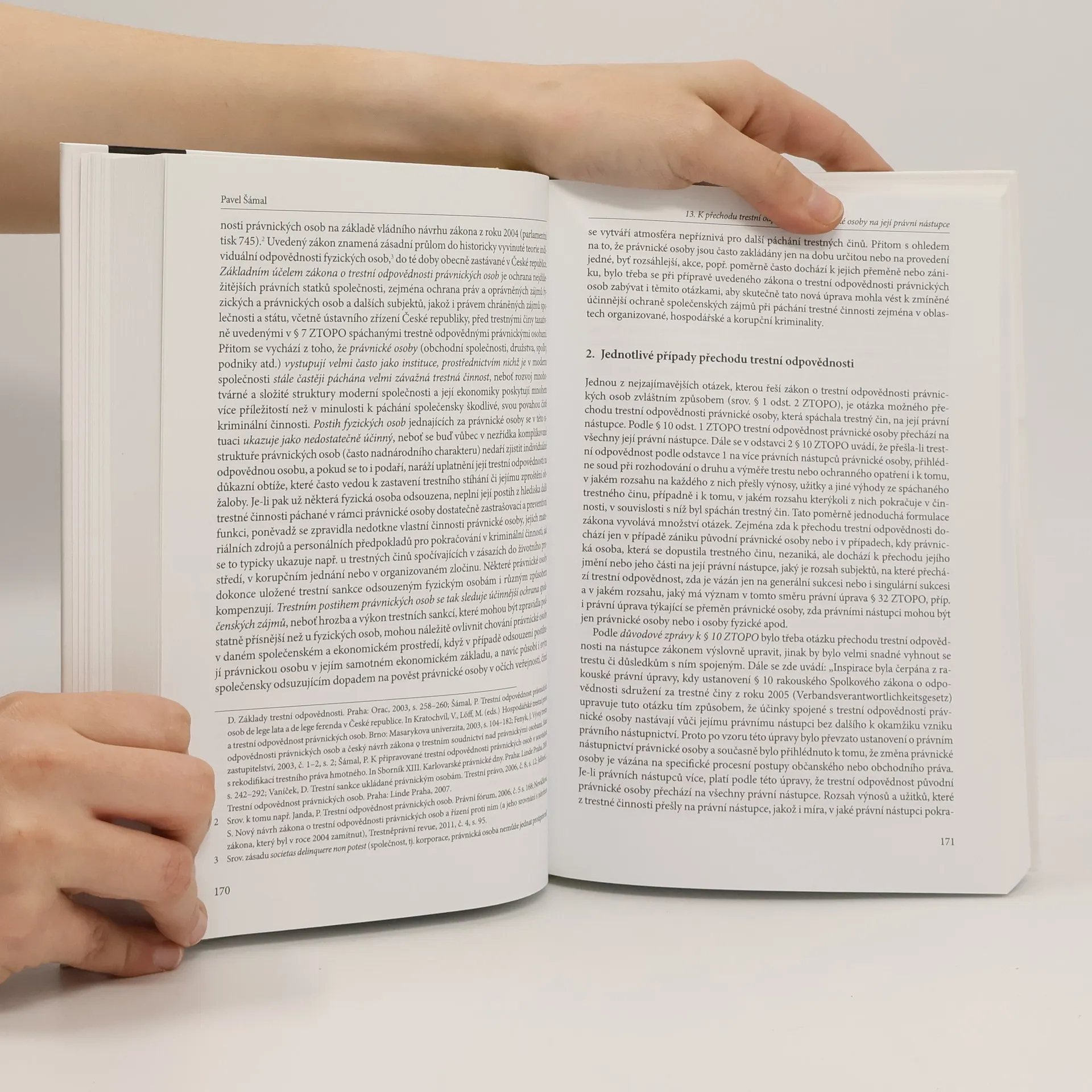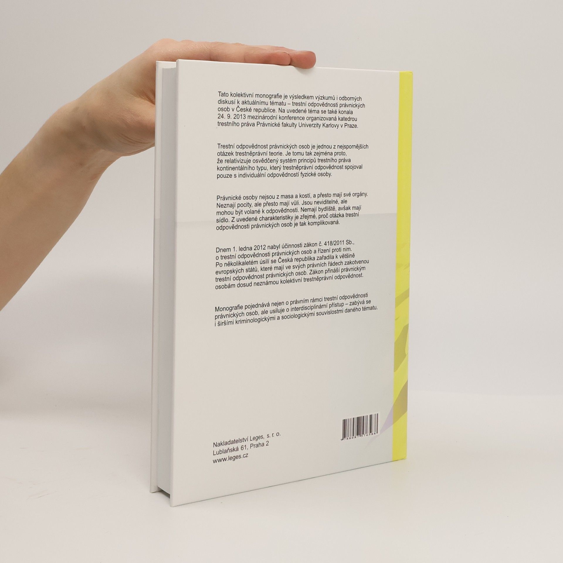 Tato kolektivní monografie je výsledkem výzkumů a odborných diskusí k tématu trestní odpovědnosti právnických osob v České republice. Na toto téma se konala mezinárodní konference 24. 9. 2013, organizovaná katedrou trestního práva Právnické fakulty Univerzity Karlovy v Praze. Trestní odpovědnost právnických osob je jednou z nejspornějších otázek trestněprávní teorie, neboť relativizuje tradiční systém principů trestního práva kontinentálního typu, který spojoval odpovědnost pouze s fyzickými osobami. Právnické osoby, ačkoliv nejsou fyzické, mají své orgány a vůli, což komplikuje otázku jejich trestní odpovědnosti. Dnem 1. ledna 2012 nabyl účinnosti zákon č. 418/2011 Sb., o trestní odpovědnosti právnických osob a řízení proti nim, čímž se Česká republika zařadila mezi evropské státy, které tuto odpovědnost ve svých právních řádech zakotvily. Tento zákon přináší dosud neznámou kolektivní trestněprávní odpovědnost. Monografie se zaměřuje nejen na právní rámec trestní odpovědnosti právnických osob, ale také na interdisciplinární přístup, který zahrnuje širší kriminologické a sociologické souvislosti daného tématu.