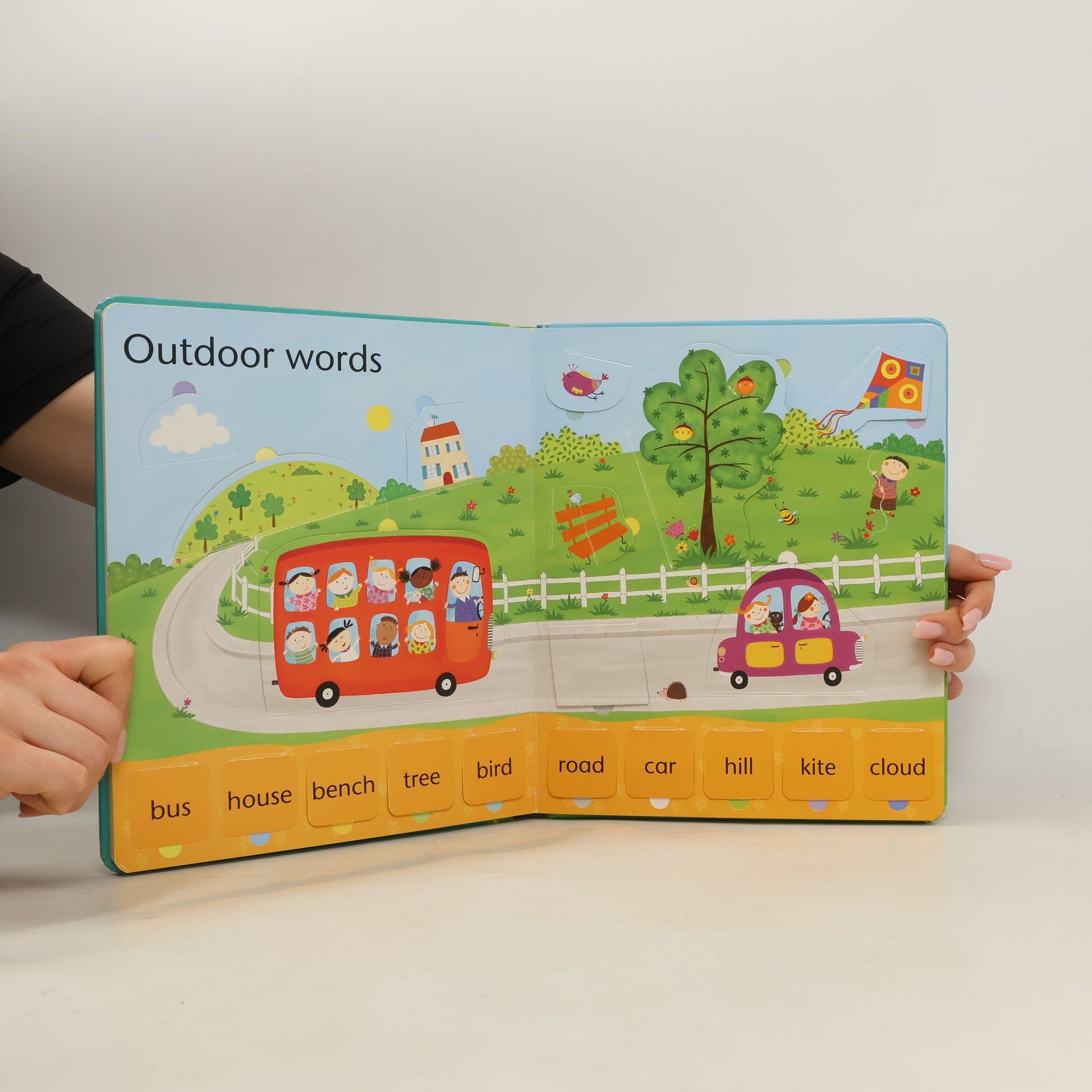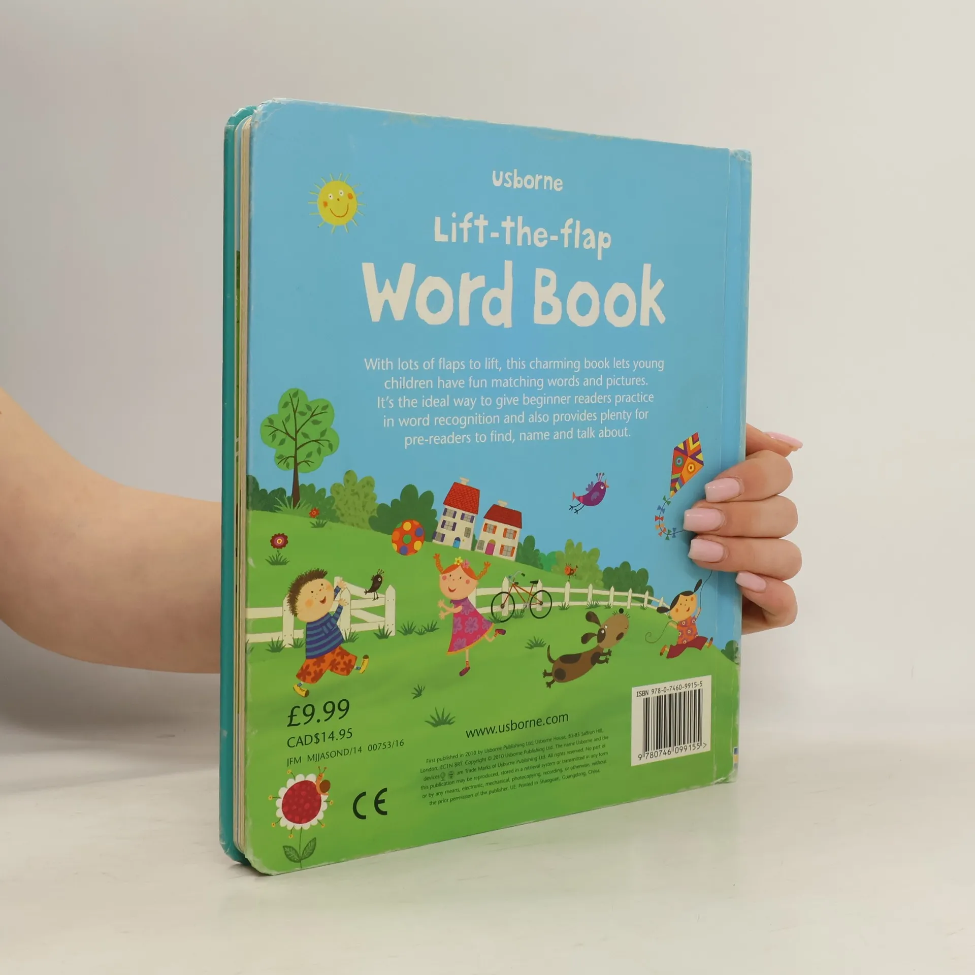 Carries EU Toy Safety Directive 'CE' logo. This is a stylish picture word book with flaps to lift to encourage word and picture association. Each themed page has plenty of flaps to lift with the word of an object or animal underneath. Smaller flaps at the bottom show the same word with an accompanying, delicately illustrated picture. The themes include the park, on the farm, at the seaside, noisy words and words at home.