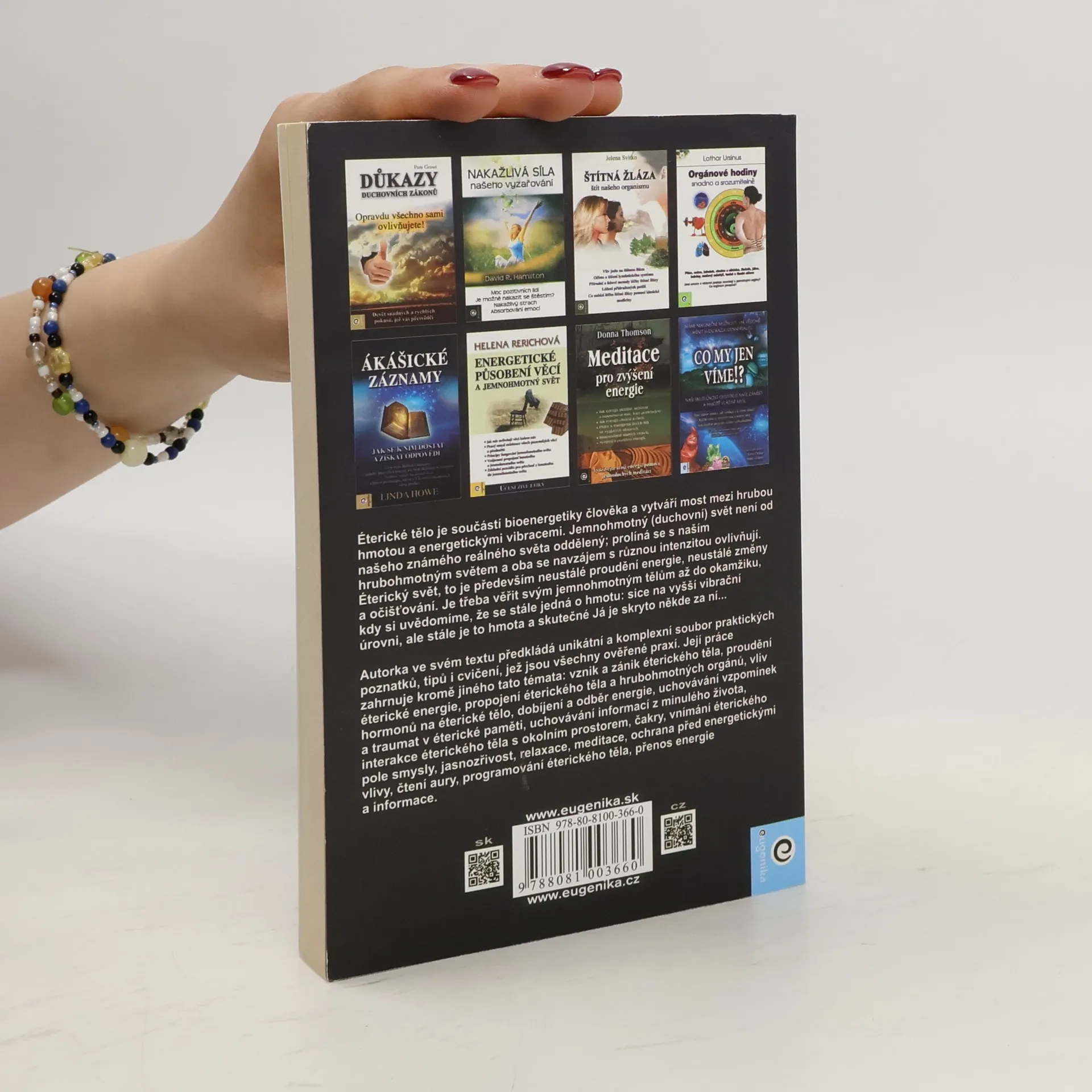Éterické tělo je součástí bioenergetiky člověka a vytváří most mezi hrubou hmotou a energetickými vibracemi. Jemnohmotný (duchovní) svět není od našeho známého reálného světa oddělený; prolíná se s naším hrubohmotným světem a oba se navzájem s různou intenzitou ovlivňují. Éterický svět, to je především neustálé proudění energie, neustálé změny a očišťování. Je třeba věřit svým jemnohmotným tělům až do okamžiku, kdy si uvědomíme, že se stále jedná o hmotu: sice na vyšší vibrační úrovni, ale stále je to hmota a skutečné Já je skryto někde za ní... Slovenská autorka ve svém textu předkládá unikátní a komplexní soubor poznatků, tipů i cvičení, jež jsou všechny ověřené praxí. Její práce zahrnuje kromě jiného tato témata: vznik a zánik éterického těla, proudění éterické energie, propojení éterického těla a hrubohmotných orgánů, vliv hormonů na éterické tělo, dobíjení a odběr energie, uchovávání vzpomínek a traumat v éterické paměti, uchovávání informací z minulého života, interakce éterického těla s okolním prostorem, čakry, vnímání éterického pole smysly, jasnozřivost, relaxace, meditace, ochrana před energetickými vlivy, čtení aury, programování éterického těla, přenos energie a informací.