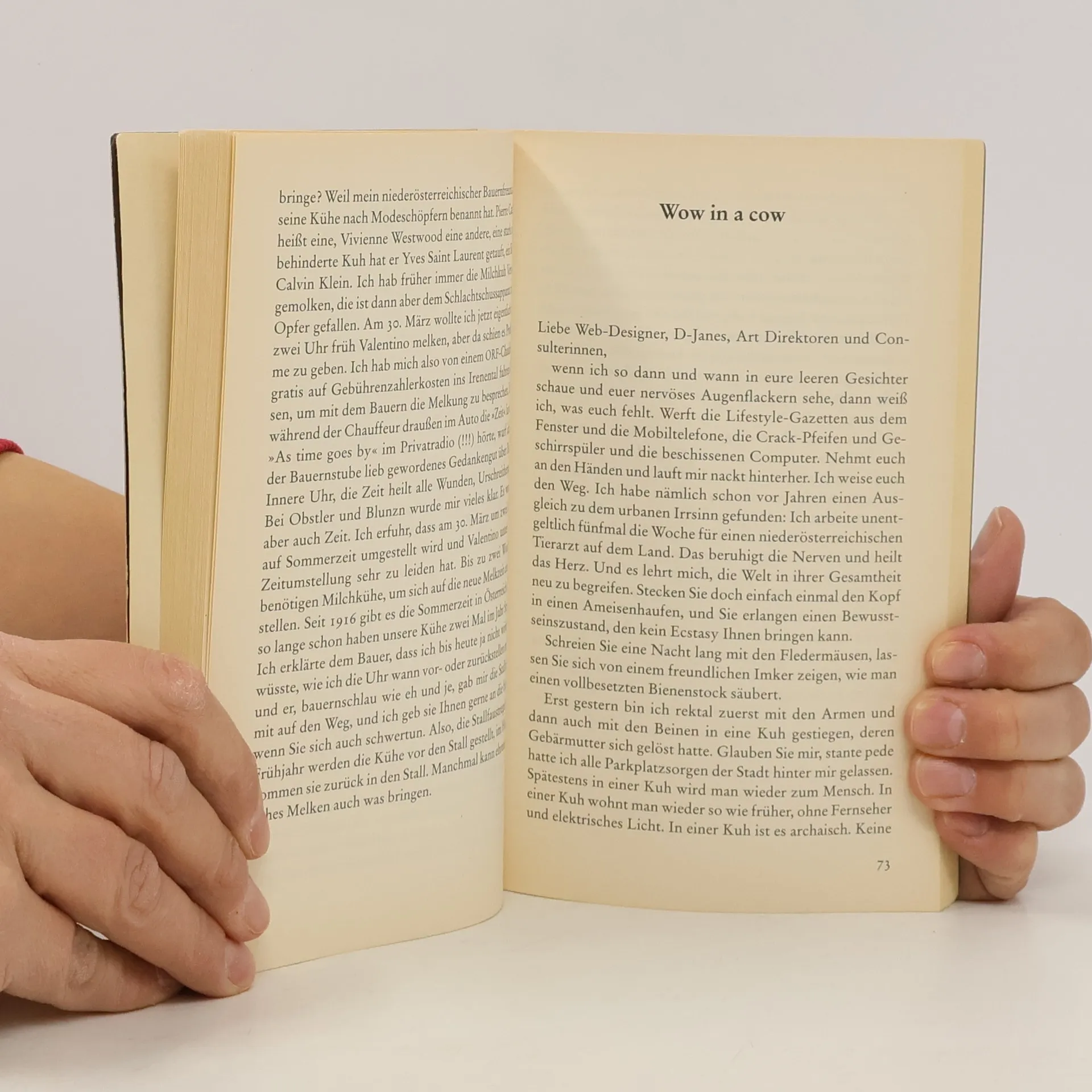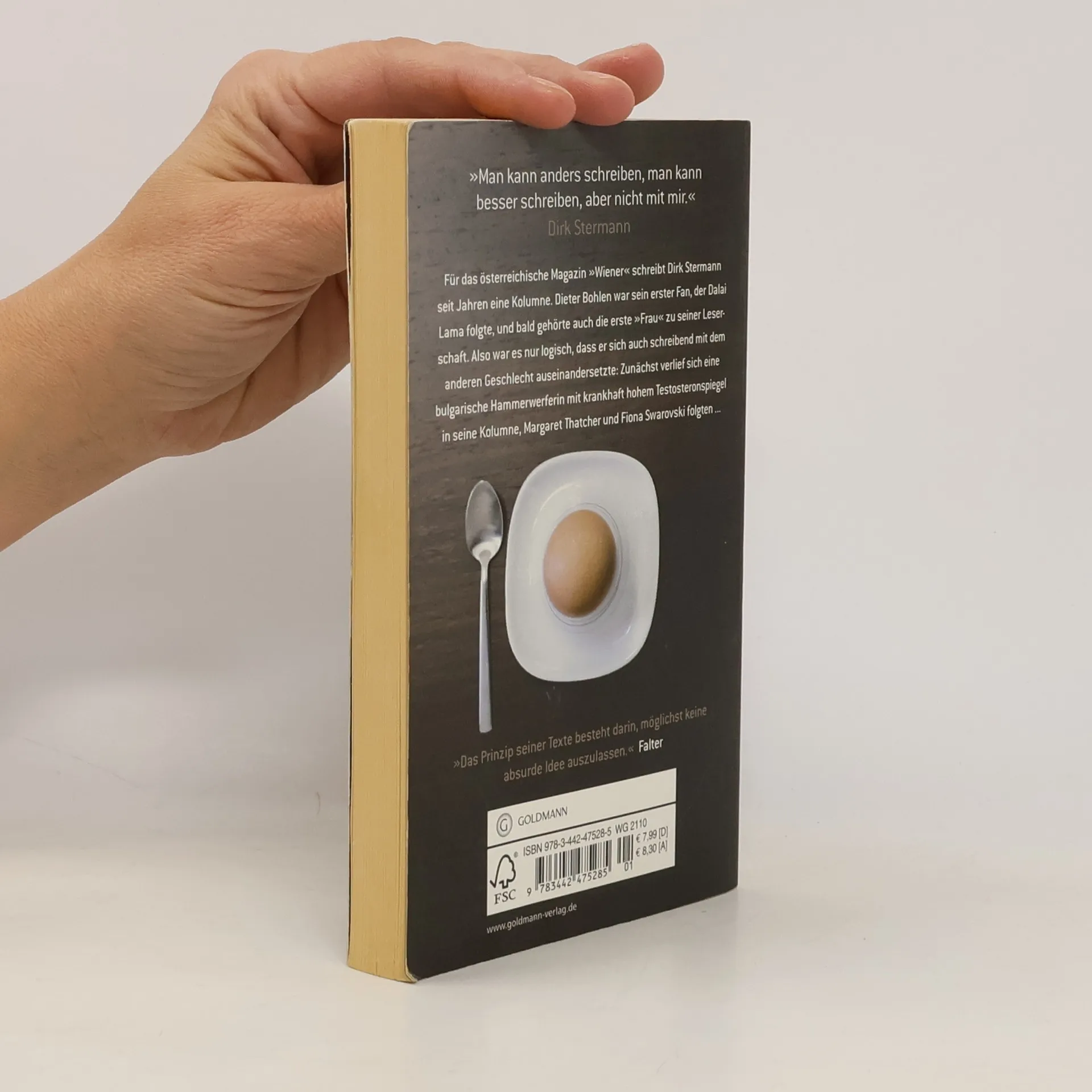 Für das österreichische Männermagazin „Wiener“ schreibt Dirk Stermann seit Jahren die Kolumne auf der letzten Seite jeder Ausgabe. Eine Auswahl dieser witzigen bis skurrilen Texte versammelt der Band „Eier“ – garniert mit 14 echten Eiern und erweitert um ein paar „Bonus-Tracks“. Zum Nachlesen und Neuentdecken: Stermanns Kolumnen, die ihn nach seiner Aussage „wenig Zeit und Aufwand kosten, dem Leser aber interessante und ulkige Minuten garantieren“.