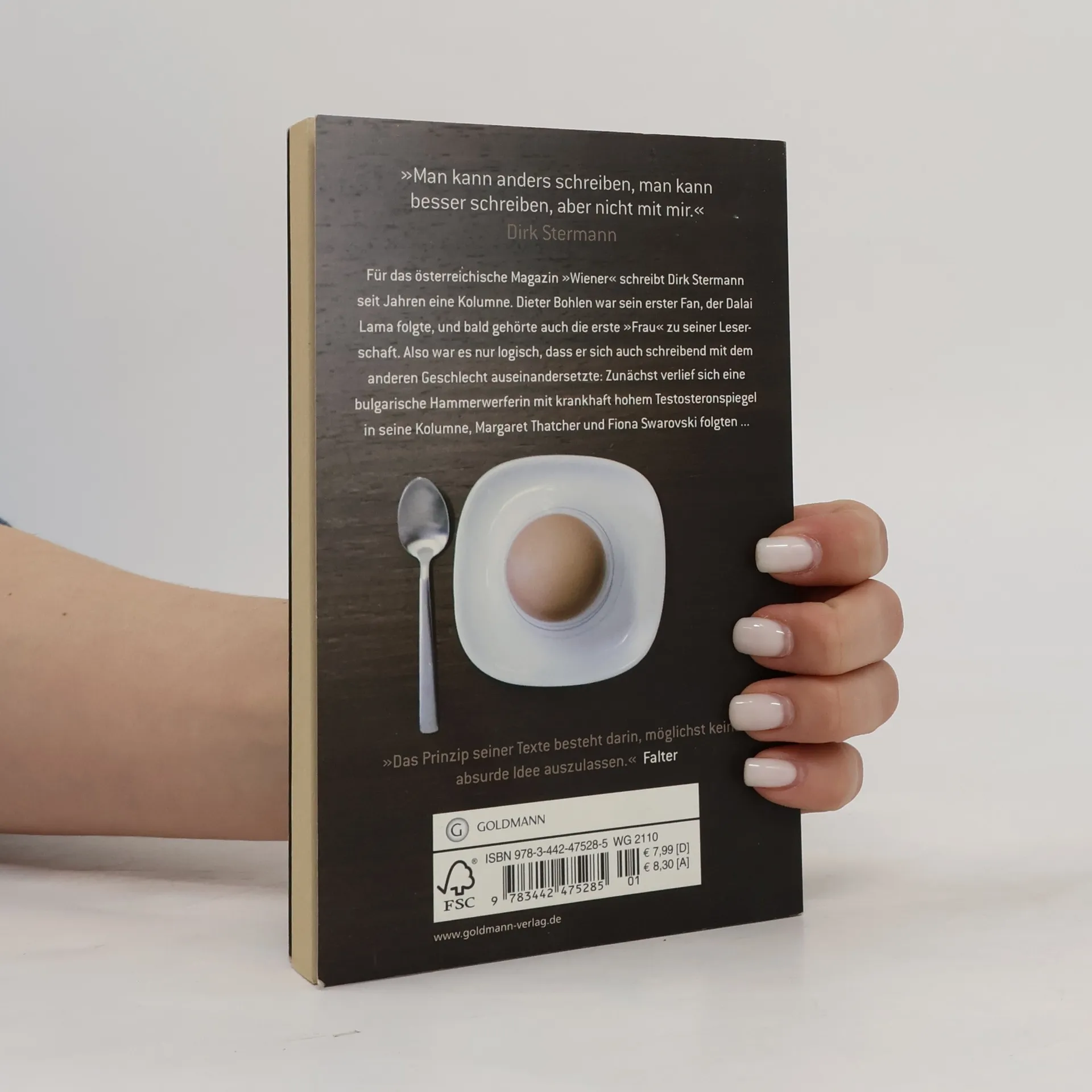 Für das österreichische Männermagazin „Wiener“ schreibt Dirk Stermann seit Jahren die Kolumne auf der letzten Seite jeder Ausgabe. Eine Auswahl dieser witzigen bis skurrilen Texte versammelt der Band „Eier“ – garniert mit 14 echten Eiern und erweitert um ein paar „Bonus-Tracks“. Zum Nachlesen und Neuentdecken: Stermanns Kolumnen, die ihn nach seiner Aussage „wenig Zeit und Aufwand kosten, dem Leser aber interessante und ulkige Minuten garantieren“.