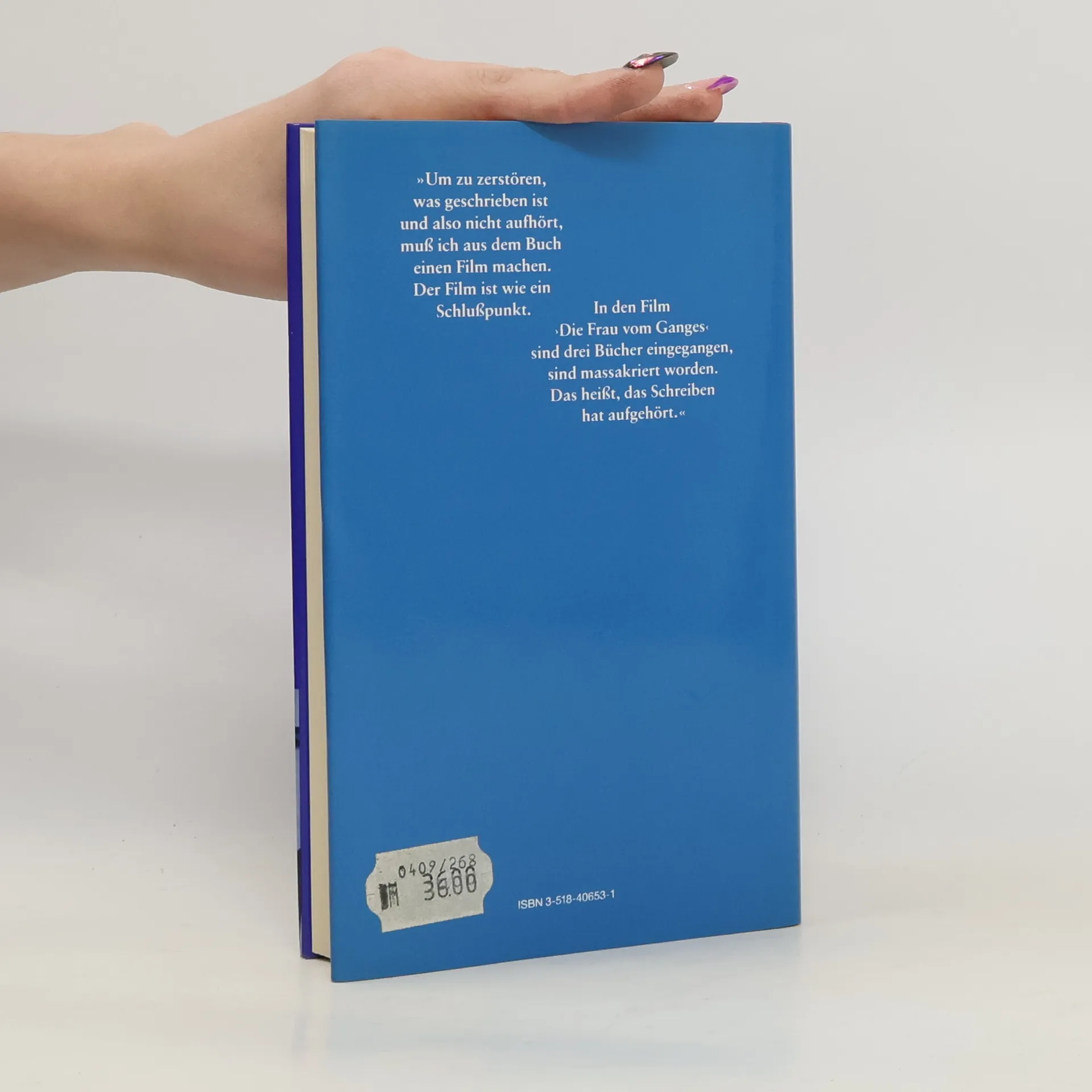 Um zu zerstören, was geschrieben ist und also nicht aufhört, muß ich aus dem Buch einen Film machen. Der Film ist wie ein Schlußpunkt. In den Film Die Frau vom Ganges sind drei Bücher eingegangen, sind massakriert worden. Das heißt, das Schreiben hat aufgehört. (Marguerite Duras)