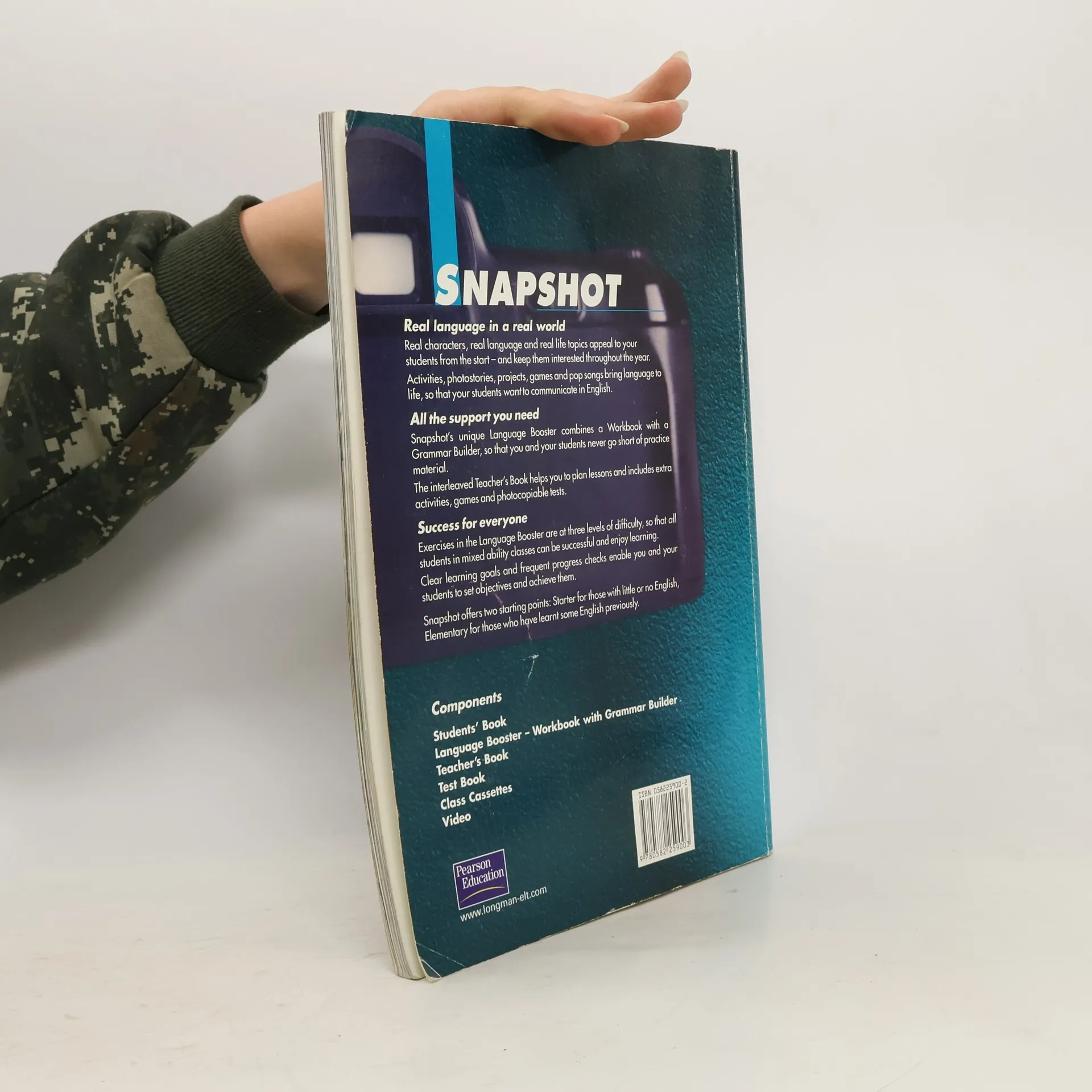 Real Language in a real world. Real characters, real language and real, life topics appeal to your students from the start -- and keep them interested throughout the year. Activities, photostories, projects, games and pop songs bring language to life, so that your students want to communicate in English. All the support you need. Snapshot's unique Language Booster combines a workbook with a grammar builder, so that you and your students never go short of practice material. The interleaved Teachers' Book helps you to plan lessons and includes extra activities, games and photocopiable tests. Success for everyone. Exercises in the Language Booster are at three levels of difficulty, so that all students in mixed ability classes can be successful and enjoy learning. Clear learning goals and frequent progress checks enable you and your students to set objective sand achieve them. Snapshot offers two starting points: Starter for those with little or no English, Elementary for those who have learnt some English previously.