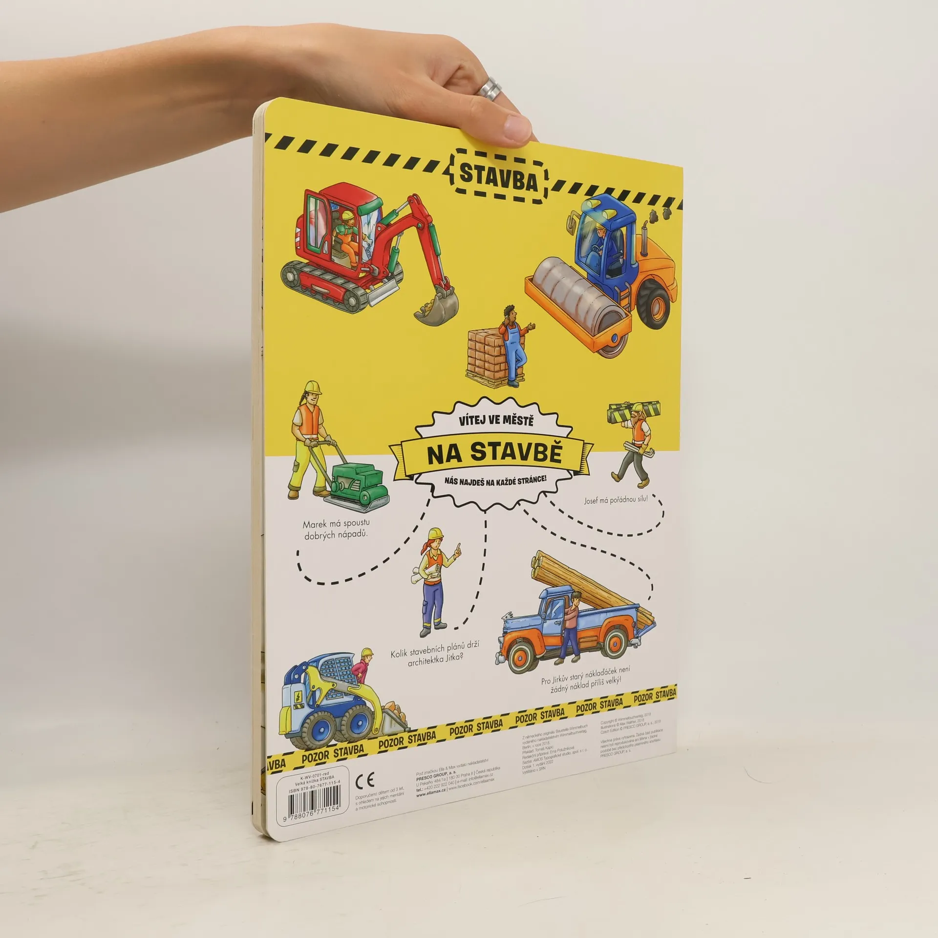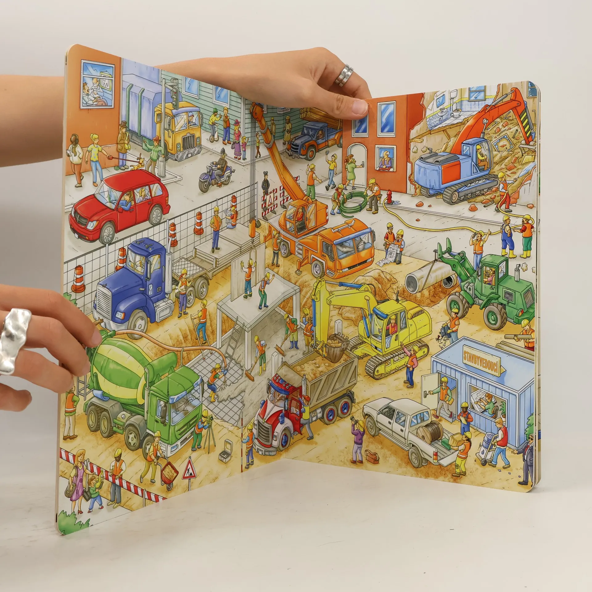 V centru města, na jeho okrajích, v parku, na řece – tam všude se kope, opravuje, rekonstruuje, zušlechťuje, staví… Náklaďáky, míchačky, bagry, jeřáby, vysokozdvižné vozíky a další zajímavé stroje pracují na plné obrátky a kolem nich panuje čilý ruch. Činí se tu pěkná řádka šikovných řemeslníků, jimž velí zkušený předák, a na všechno dohlíží stavbyvedoucí. Ruku k dílu přiloží i architekt, fotograf nebo třeba zahradník. A protože jsme ve městě, hemží se to tady i spoustou dalších postaviček. Všechny zažívají své vlastní mikropříběhy, o nichž si můžete donekonečna vyprávět. Některé z postav a strojů naleznete na každém obrázku v této knize – procvičte svou paměť a pozornost a stránku za stránkou „čtěte“ jejich dobrodružství v propracovaných ilustracích! Prostřednictvím půvabných obrázků se malí čtenáři naučí nejen nalézat slova, popisovat, vyprávět, ale také vnímat knihu jako zdroj informací, vědění i zábavy.