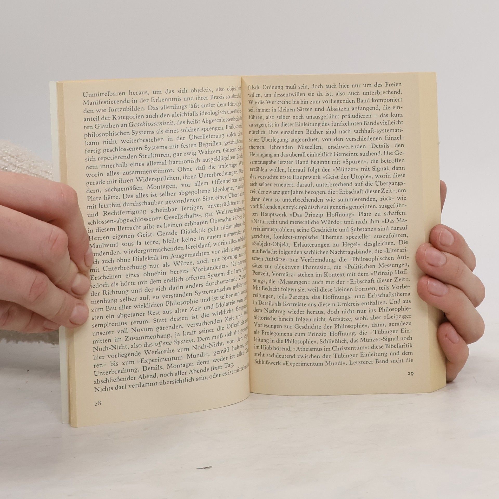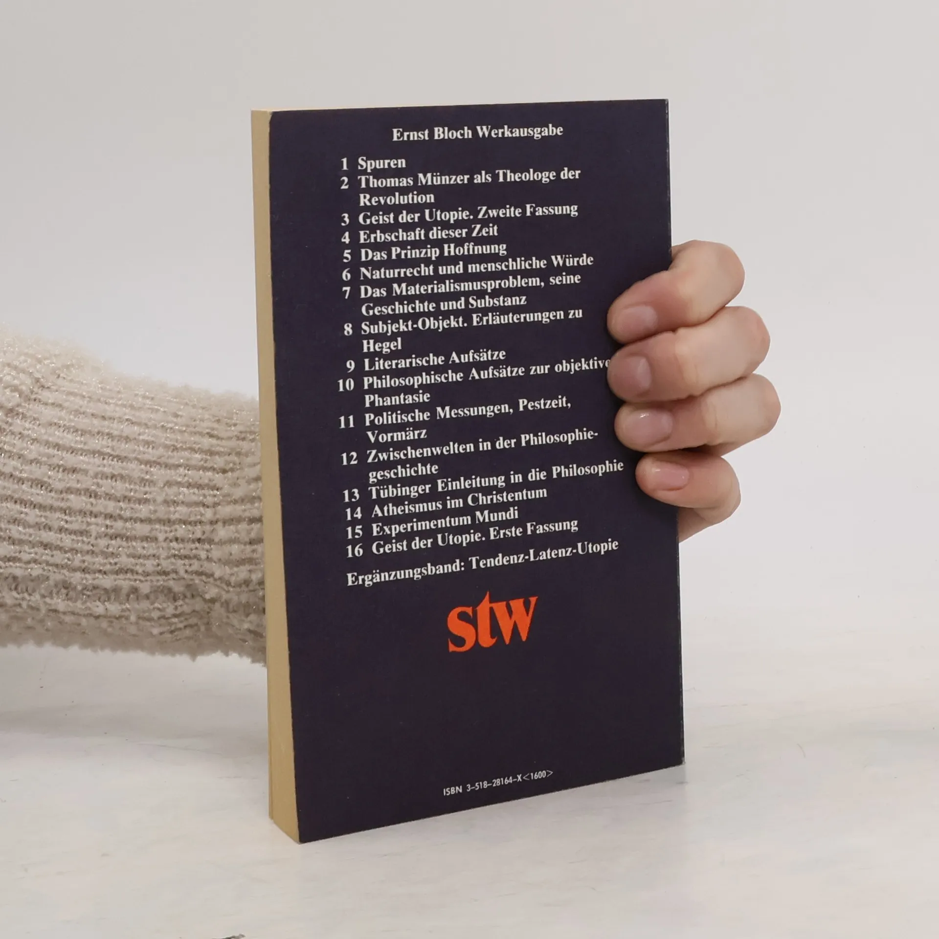 Ernst Bloch Werkausgabe 01. Spuren 02. Thomas Münzer als Theologe der Revolution 03. Geist der Utopie. Zweite Fassung 04. Erbschaft dieser Zeit 05. Das Prinzip Hoffnung 06. Naturrecht und menschliche Würde 07. Das Materialismusproblem, seine Geschichte und Substanz 08. Subjekt-Objekt. Erläuterungen zu Hegel 09. Literarische Aufsätze 10. Philosophische Aufsätze zur objektiven Phantasie 11. Politische Messungen, Pestzeit, Vormärz 12. Zwischenwelten in der Philosophiegeschichte 13. Tübinger Einleitung in die Philosophie 14. Atheismus im Christentum 15. Experimentum Mundi 16. Geist der Utopie. Erste Fassung Ergänzungsband: Tendenz-Latenz-Utopie