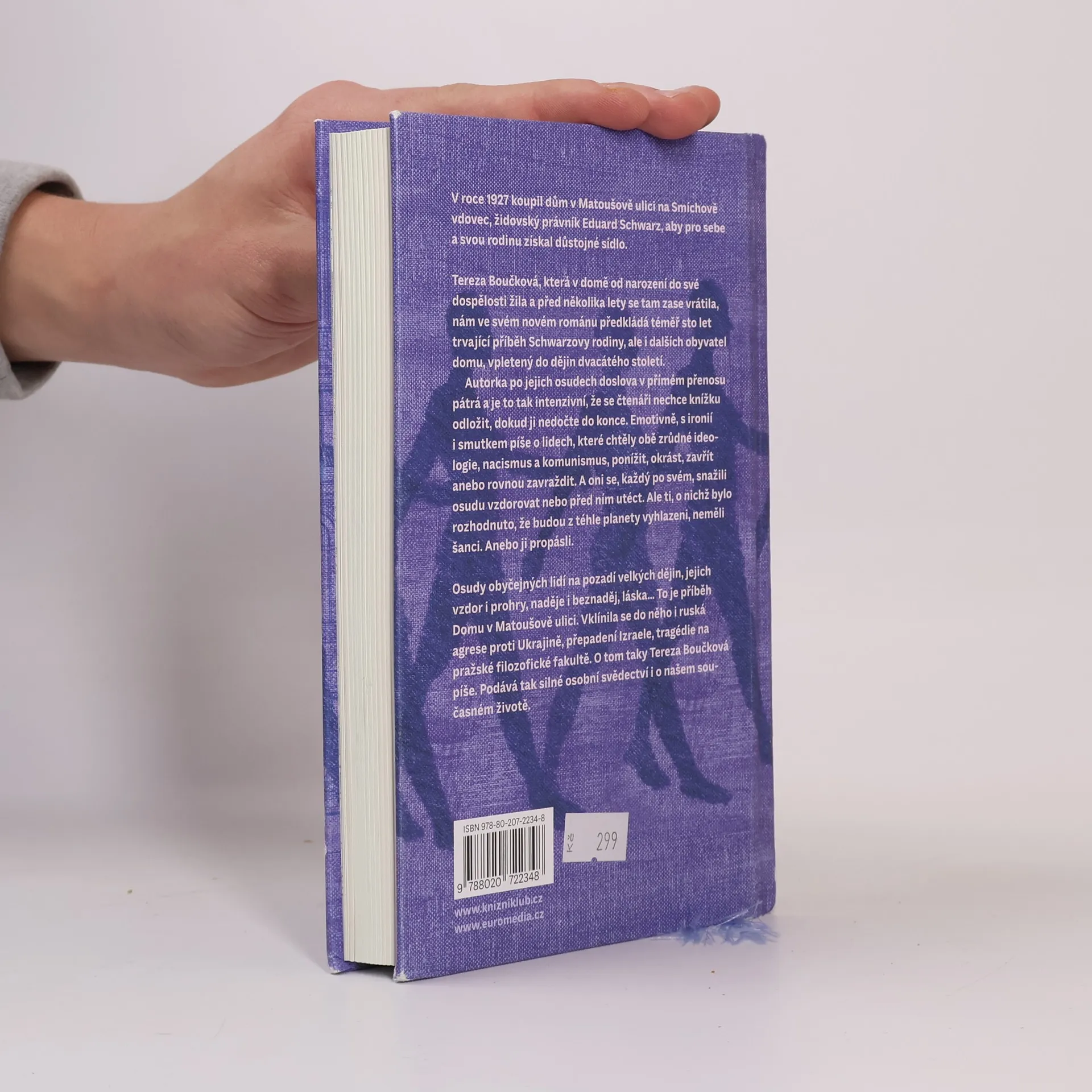 V roce 1927 koupil dům v Matoušově ulici na Smíchově vdovec, židovský právník Eduard Schwarz, aby pro sebe a svou rodinu získal důstojné sídlo. Měl štěstí, že zemřel dřív než začala druhá světová válka. Tereza Boučková, která v domě od narození do své dospělosti žila a před několika lety se tam zase vrátila, nám ve svém románu předkládá téměř sto let trvající příběh Schwarzových potomků, ale i dalších obyvatel domu, vpletený do dějin dvacátého století. Autorka po jejich osudech doslova v přímém přenosu pátrá a je to tak intenzivní, že se čtenáři nechce knížku odložit, dokud ji nedočte do konce. Emotivně, s ironií, ale i smutkem píše o lidech, které chtěly obě zrůdné ideologie, nacismus a komunismus, ponížit, okrást, zavřít anebo zavraždit.