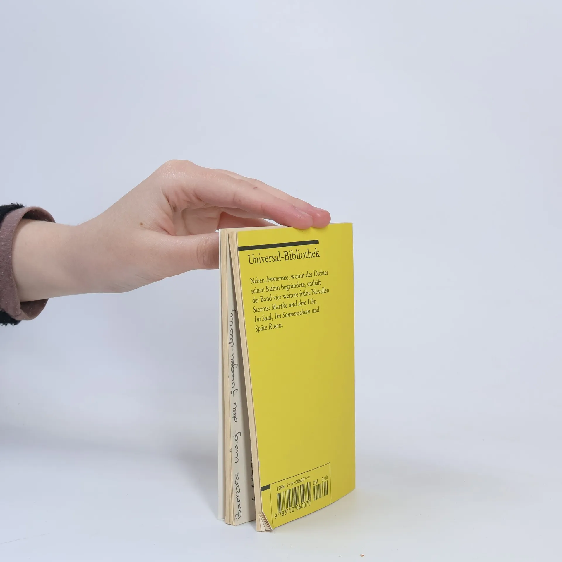 Neben »Immensee«, womit der Dichter seinen Ruhm begründete, enthält der Band vier weitere frühe Novellen Storms: »Marthe und ihre Uhr«, »Im Saal«, »Im Sonnenschein« und »Späte Rosen«.