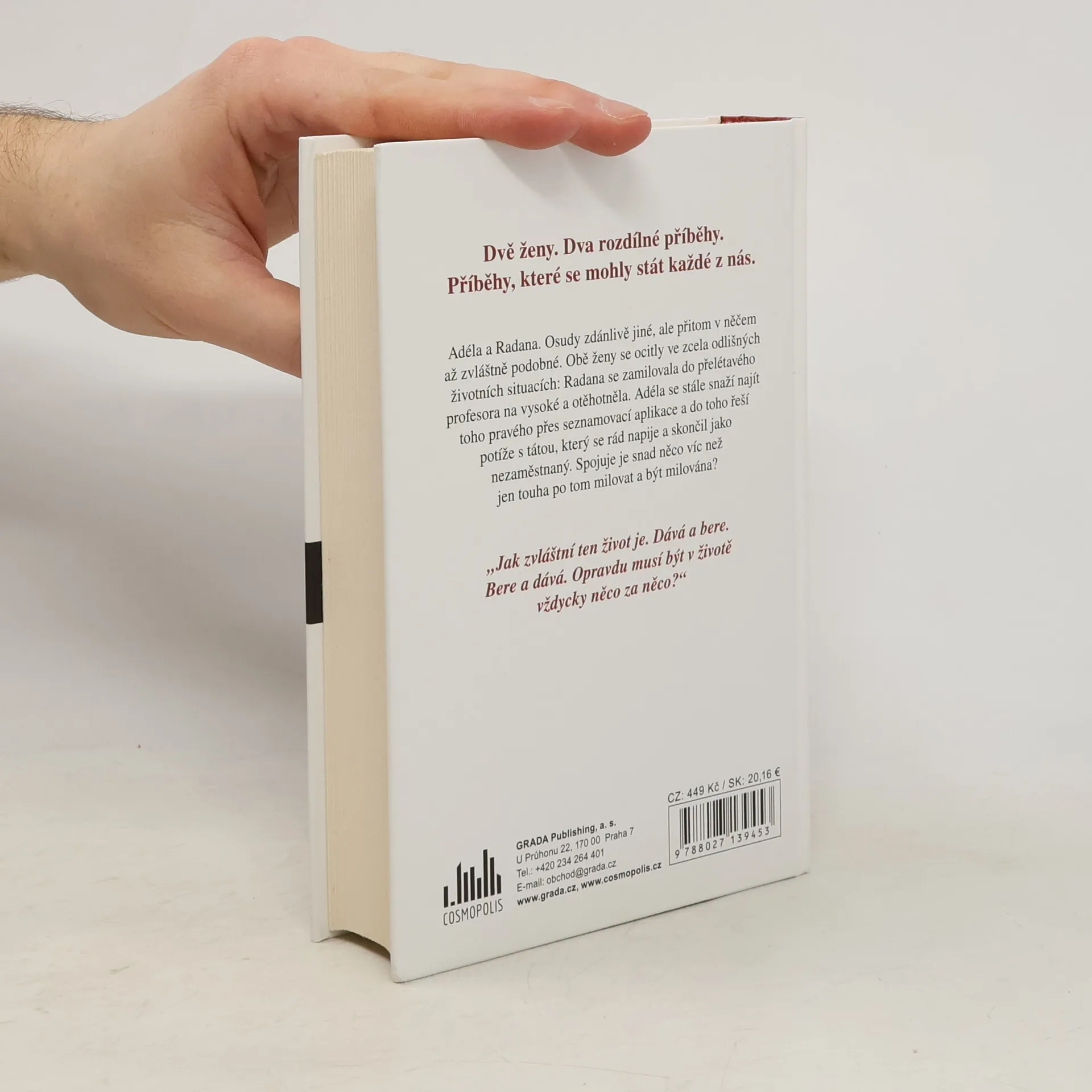 Adéla a Radana. Osudy zdánlivě jiné, ale přitom v něčem až zvláštně podobné. Obě ženy se ocitly ve zcela odlišných životních situacích: Radana se zamilovala do přelétavého profesora na vysoké a otěhotněla. Adéla se stále snaží najít toho pravého přes seznamovací aplikace a do toho řeší potíže s tátou, který se rád napije a skončil jako nezaměstnaný. Spojuje je snad něco víc než jen touha po tom milovat a být milována? „Jak zvláštní ten život je. Dává a bere. Bere a dává. Opravdu musí být v životě vždycky něco za něco?