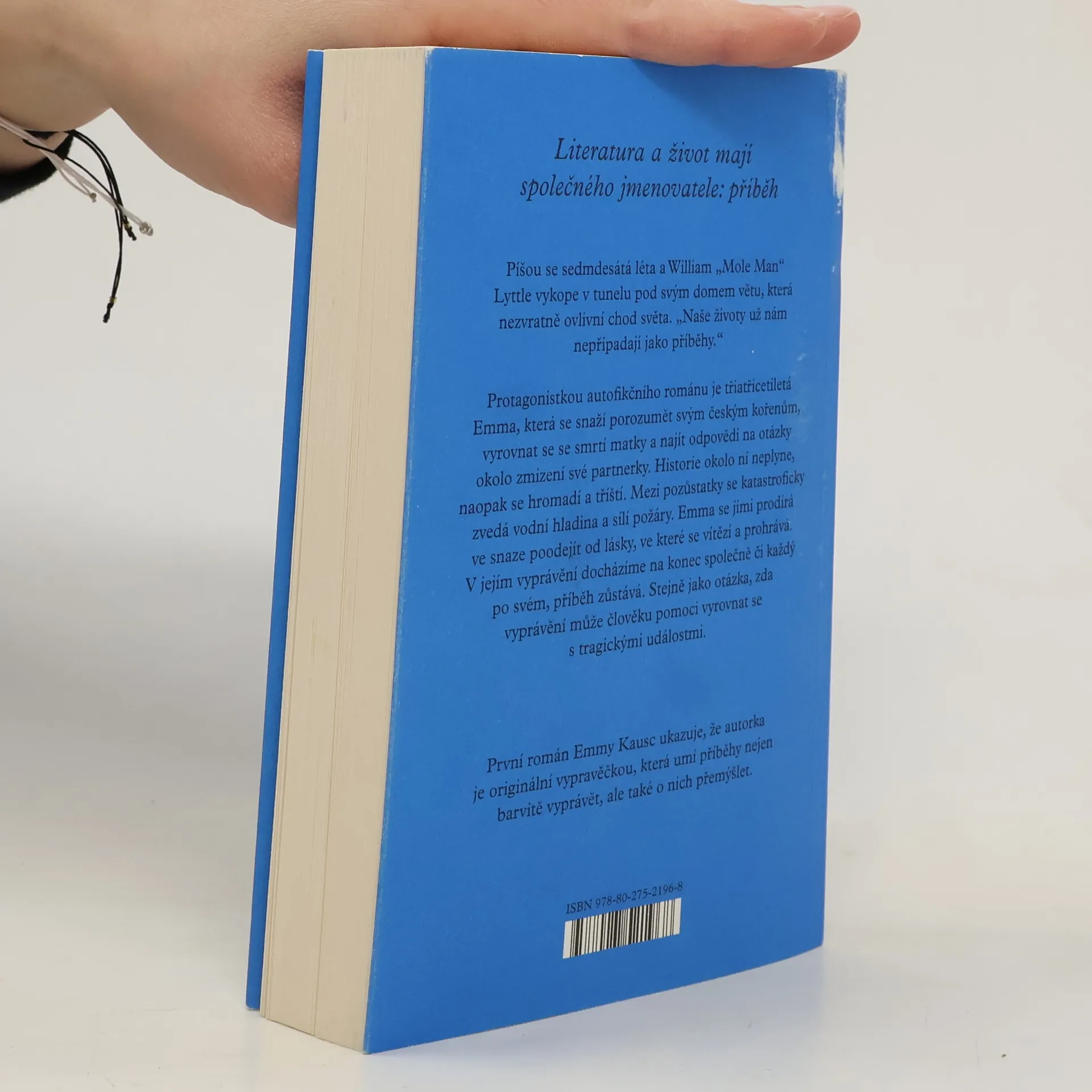Literatura a život mají společného jmenovatele: příběh. Píší se sedmdesátá léta a William „Mole Man“ Lyttle vykope v tunelu pod svým domem větu, která nezvratně ovlivní chod našeho světa. „Naše životy už nám nepřipadají jako příběhy.“ Protagonistkou autofikčního románu je třiatřicetiletá Emma, která se snaží porozumět svým českým kořenům, vyrovnat se se smrtí matky a najít odpovědi na otázky okolo zmizení své partnerky. Historie okolo ní neplyne, naopak se hromadí a tříští. Mezi pozůstatky se katastroficky zvedá vodní hladina a sílí požáry. Emma se jimi prodírá ve snaze poodejít od lásky, ve které se vítězí a prohrává. V jejím vyprávění docházíme na konec společně či každý po svém, příběh zůstává. Stejně jako otázka, zda vyprávění může člověku pomoci vyrovnat se s tragickými událostmi. První román Emmy Kausc ukazuje, že autorka je originální vypravěčkou, která umí příběhy nejen barvitě vyprávět, ale také o nich přemýšlet.