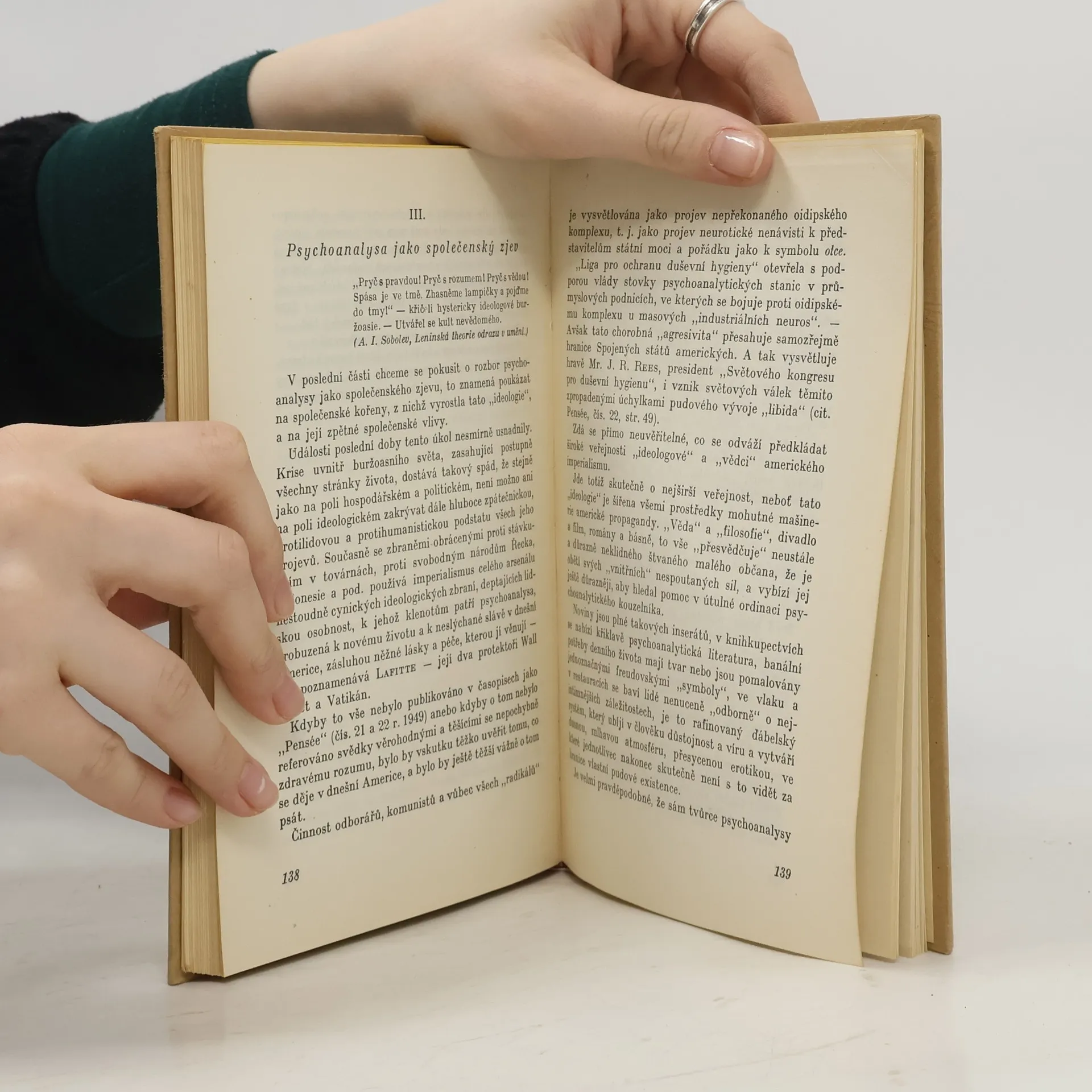 Psychoanalysu jako společenský zjev kritisuje autorka takto: "Události poslední doby usnadnily nesmírně veškerý rozbor psychoanaly. Krise uvnitř buržoas. světa, zasahující postupně všechny stránky života, dostává takový spád, že stejně jako na poli hospodář. a politickém, ani na poli ideologickém není možno dále zakrývat hluboce zpátečnickou, protilidovou a protihumanistickou podstatu všech jeho projevů. Současně se zbraněmi, obrácenými proti stávkujícím v továrnách, proti svobod. národům Řecka, Indonesie a pod., používá imperialismus celého arsenálu nestoudně cynických ideolog. zbraní, lidskou osobnost deptajících, k jehož klenotům patří psychoanalysa". Rozvržení: I. Theoretická základna psychoanalysy: A) Vědec. představy o vývoji a struktuře lid. duševna a psychoanalysa, B) Lid. osobnost a člověk psychoanalysy, II. Psychoanalysa jako terapeut. methoda. III. Psychoanalysa jako společen. zjev.