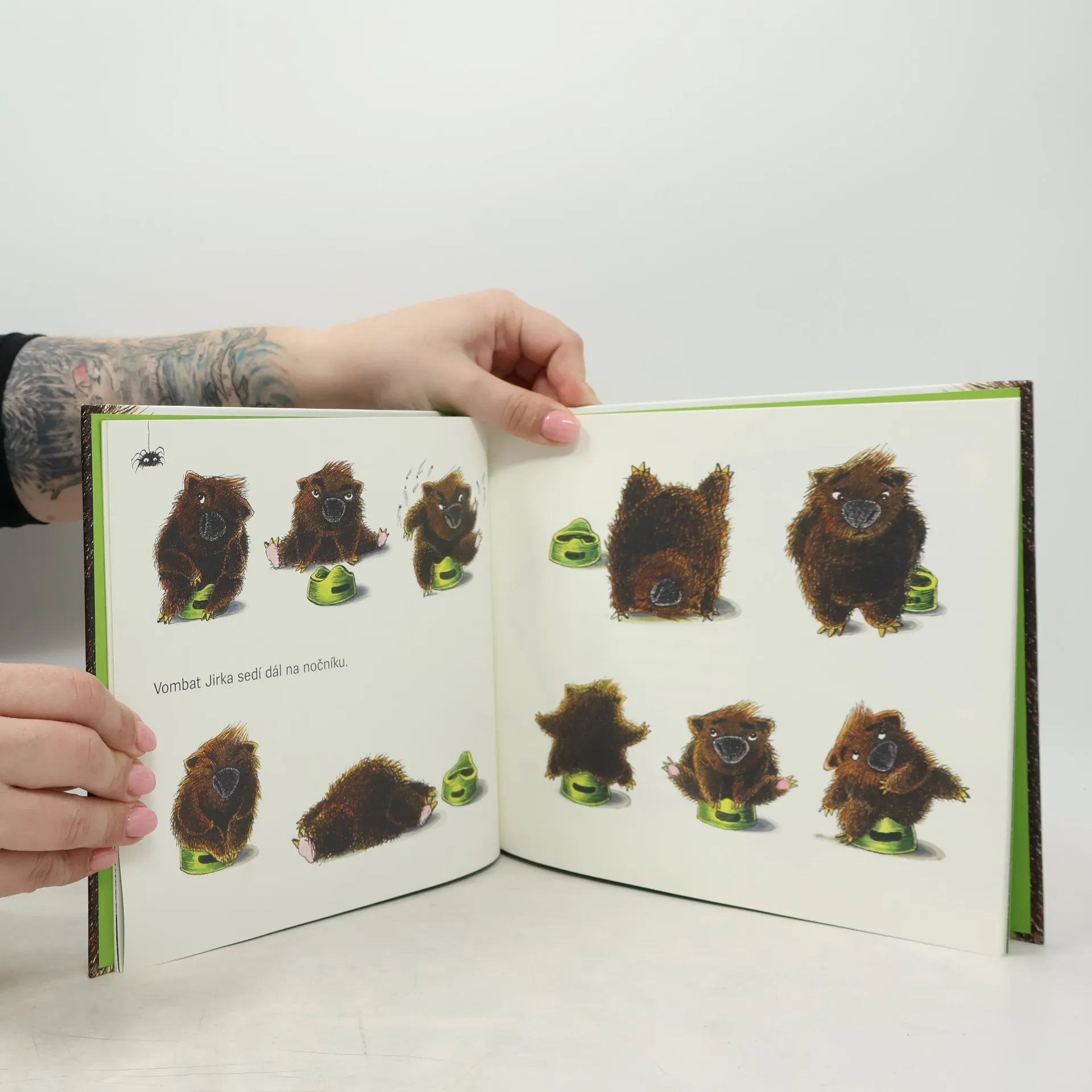 Udělat bobek nemusí být až tak snadné. Malý vombat o tom ví své. Veselý příběh pro malé majitele nočníků. Vombat je zvláštní zvířátko, které žije na druhé straně zeměkoule, až v daleké Austrálii. Hrozně rádo spí a taky hrozně rádo hrabe díry. I malý vombatí kluk Jirka je rád hrabe jako jeho tatínek. Jenomže i malí vombati musí chodit na nočník. A tak maminka rozhodne - nejdřív nočník, pak hrabání. Jirka sedí a sedí, ale na nočníku se mu nedaří. Chodí kolem něj kamarádi a udílejí mu všemožné přátelské rady, co dělat, aby se dařilo. Nakladatelská anotace. Kráceno.