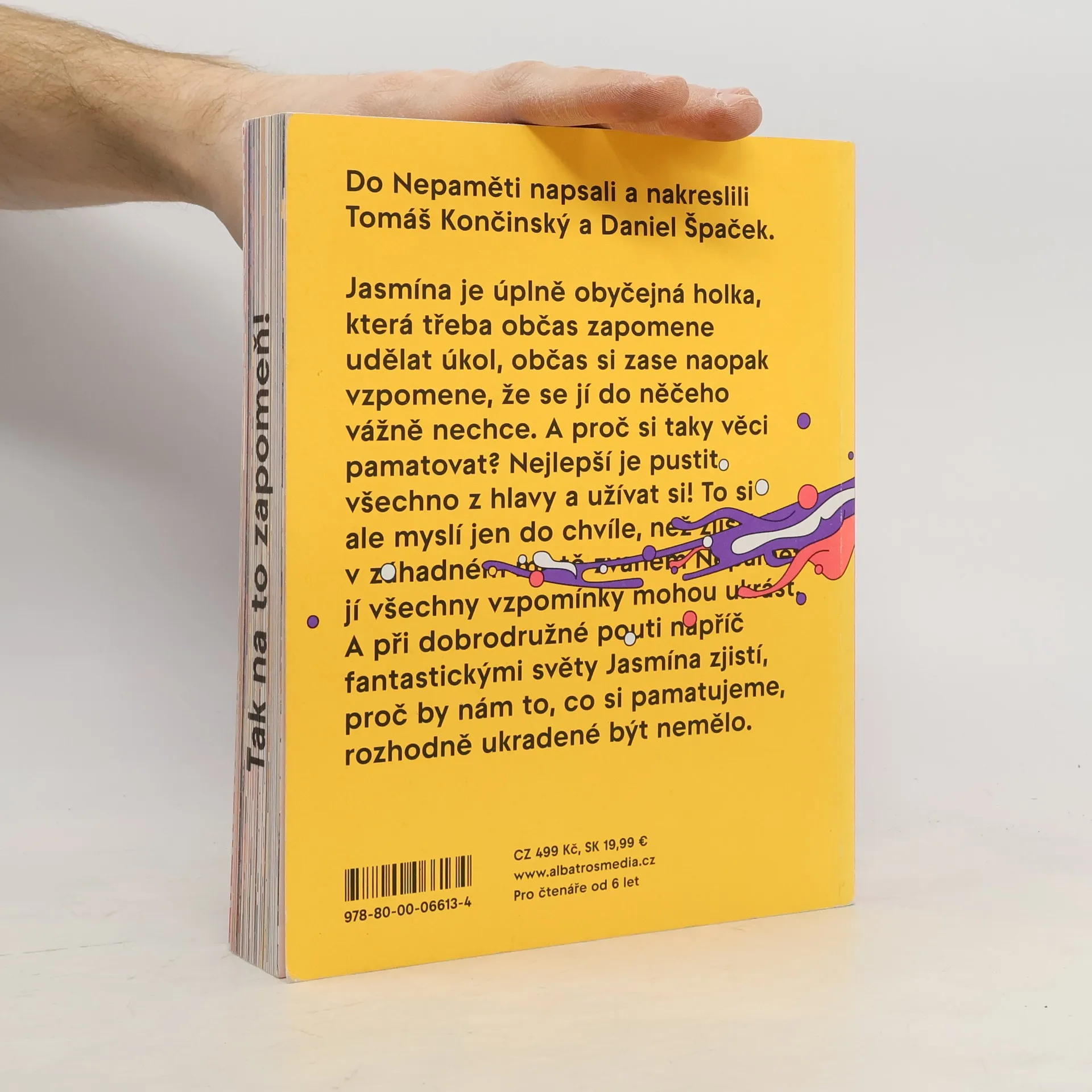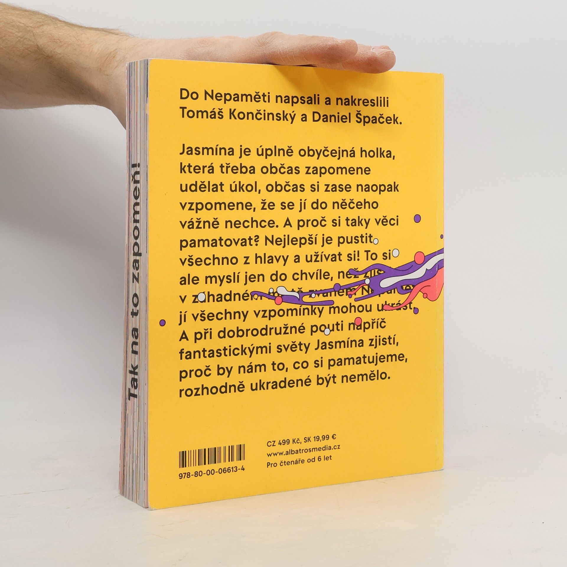 "Napínavý příběh z říše poztrácených vzpomínek od držitelů ceny Magnesia Litera." Jasmína je úplně obyčejná holka, která třeba občas zapomene udělat úkol, občas si zase naopak vzpomene, že se jí do něčeho vážně nechce. A proč si taky věci pamatovat? Nejlepší je pustit všechno z hlavy a užívat si! To si ale myslí jen do chvíle, než zjistí, že v záhadném místě zvaném Nepaměť jí všechny vzpomínky mohou ukrást. A při dobrodružné pouti napříč fantastickými světy Jasmína zjistí, proč by nám to, co si pamatujeme, rozhodně ukradené být nemělo.