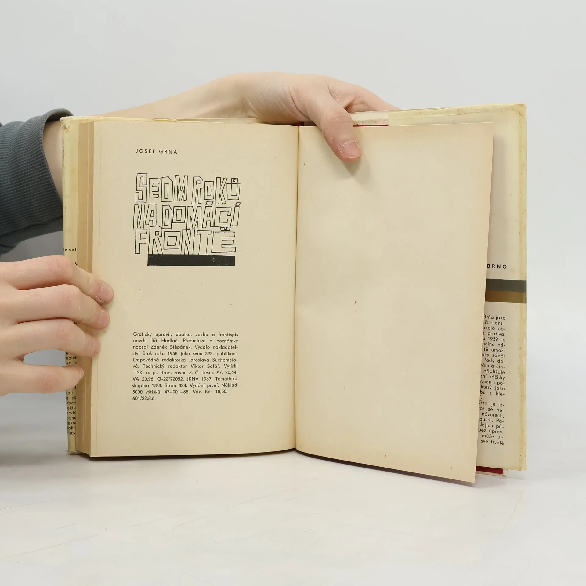 Sedm roků na domácí frontě / Josef Grňa. Vzpomínky a úvahy přední osobnosti našeho domácího odboje byly dokončeny v květnu v roce 1948. Dr. Josef Grňa (1897-1967) popisuje nejen programy, organizační strukturu a akce odbojových organizací, hlavně „Petičního výboru Věrni zůstaneme“ a„Rady Tří“ a perzekuci gestapem a vnitřní zradu, ale i motivy změn a postojů soudobé společnosti. Autor výstižně kreslí profily odbojových pracovníků, zároveň zachycuje události a názory, které obstály jakoby v dějinné zkoušce. Naproti tomu mluví i o svých omylech a názorech, které překonala doba a opustil i sám autor. Kniha má dvě části: První díl: Petiční výbor Věrni zůstaneme (Rok 1939, 1940, 1941). Druhý díl: Rada Tří (Rok 1942, 1943, 1944, 1945). Předmluvu a poznámky napsal Zdeněk Štěpánek. Graficky upravil, obálku, vazbu a frontispis navrhl Jiří Hadlač. Vydání první.