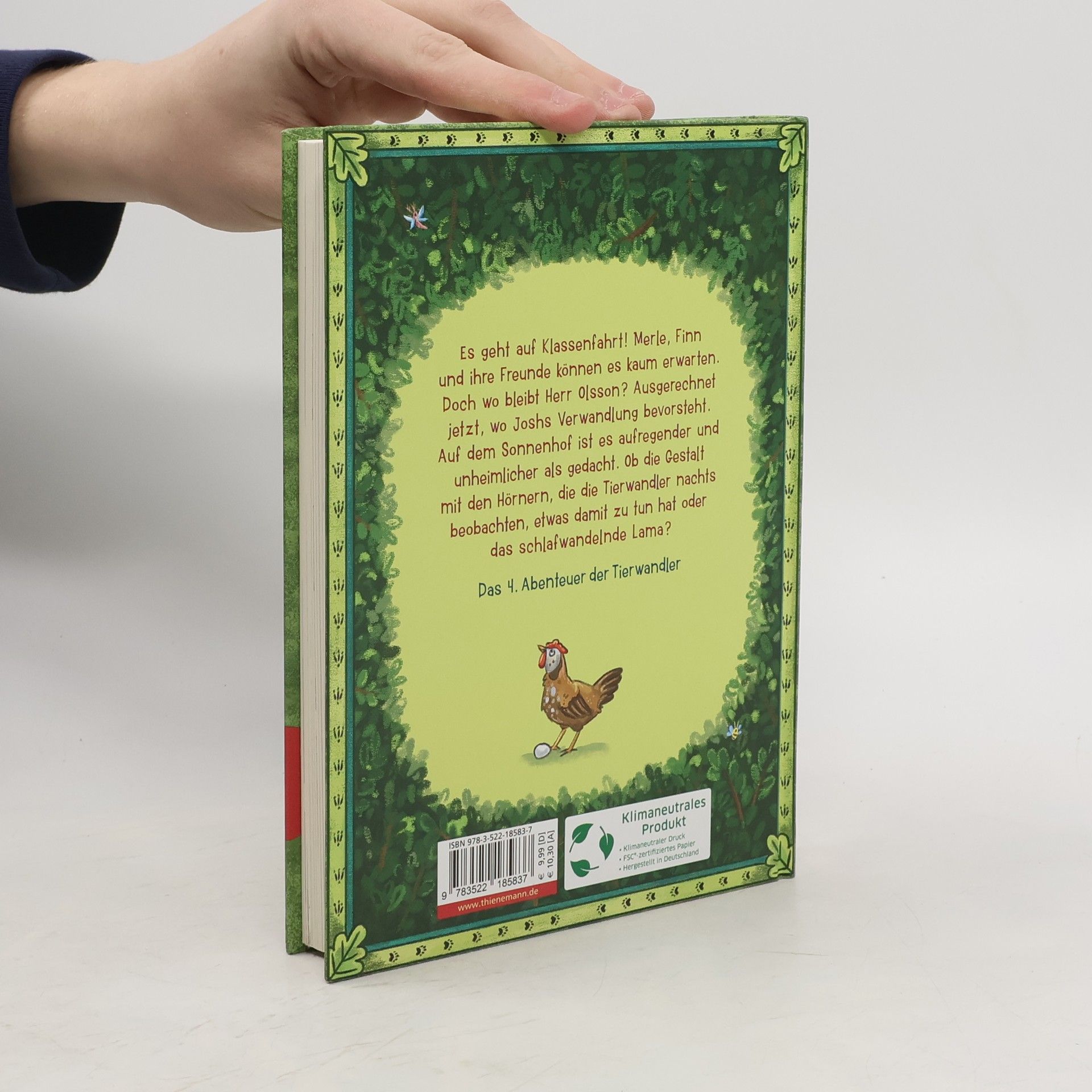 Lustige und spannende Tiergeschichte ab 8 Jahren über Kinder, die sich in Tiere verwandeln können. Mit fröhlichen schwarz-weißen Illustrationen im Innenteil. Im 4. Band der „Tierwandler“ geht es auf Klassenfahrt! Merle, Finn und die anderen Gestaltwandler freuen sich. Doch einen Wermutstropfen gibt es: Herr Olsson fährt nicht mit! Wie sollen sie bloß ohne ihn zurechtkommen. Der wüsste bestimmt, was gegen ein schlafwandelndes Lama zu tun ist. Und Josh könnte auch Hilfe gebrauchen. Warum stellt er sich nur in letzter Zeit so ungeschickt an? Wie durch ein Wunder trifft Herr Olsson dann doch noch auf dem Bauernhof ein, genau im richtigen Moment.