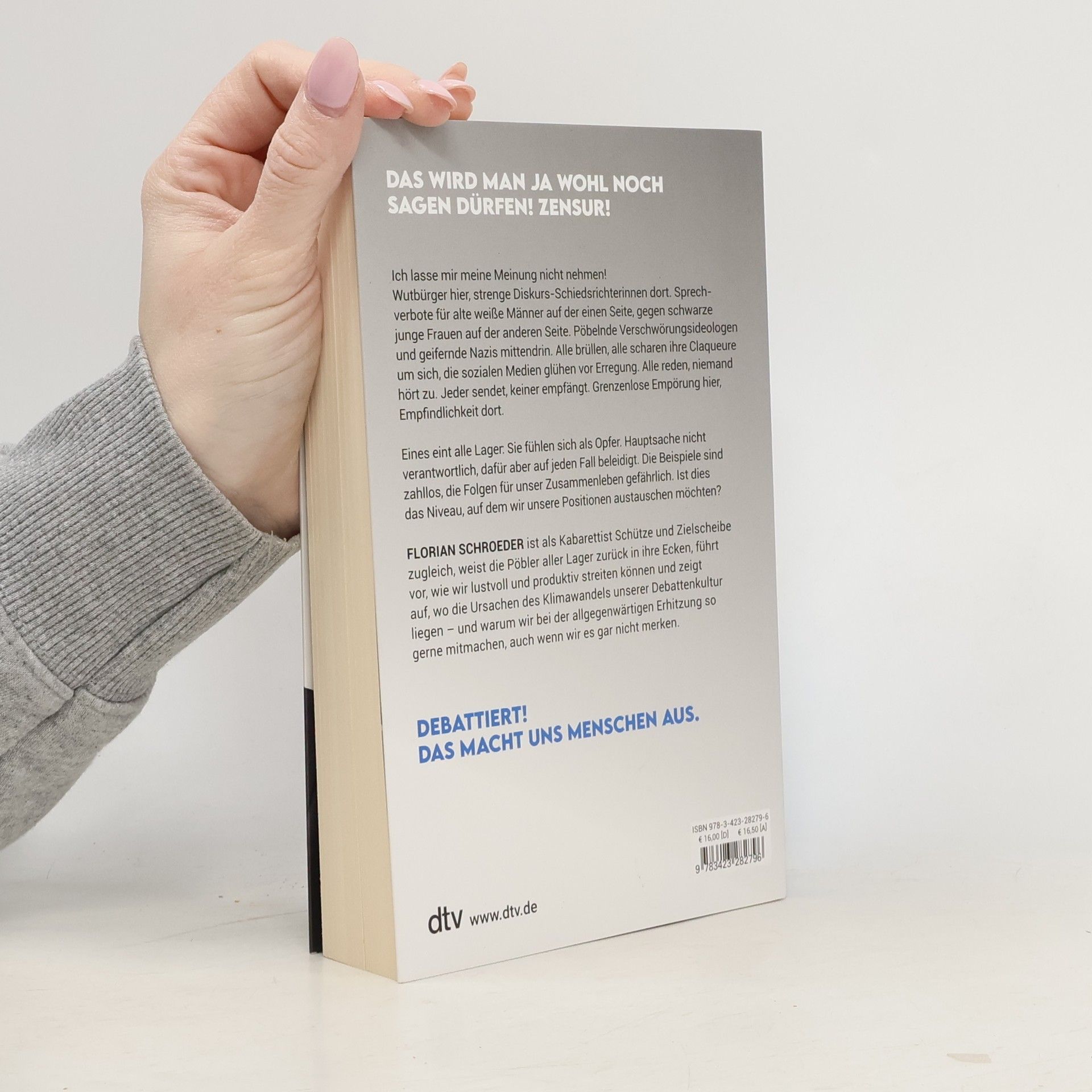 Debattiert! Das macht uns Menschen aus Das wird man ja wohl noch sagen dürfen! Wutbürger hier, politisch korrekte Diskurs-Schiedsrichterinnen dort, Sprechverbote für alte Männer auf der einen Seite, pöbelnde VerschwörungstheoretikerInnen auf der anderen Seite, egal ob mit oder ohne Migrationshintergrund, jeder brüllt, alle scharen ihre Claqueure um sich, die sozialen Medien glühen vor Erregung, doch keiner hört zu und selbst die Talkshows wirken überfordert. Plötzlich ist jeder Opfer, niemand ist verantwortlich. Die Beispiele sind zahllos, die Folgen für unser Zusammenleben gefährlich. Ist dies das Niveau, auf dem wir unsere Positionen austauschen möchten? Florian Schroeder, als Kabarettist ist er Pfeilewerfer und Zielscheibe zugleich, weist die Pöbler aller Lager zurück in ihre Ecken und zeigt, wie man lustvoll und produktiv streitet und hinterher miteinander ein (alkoholfreies) Bier trinken kann.