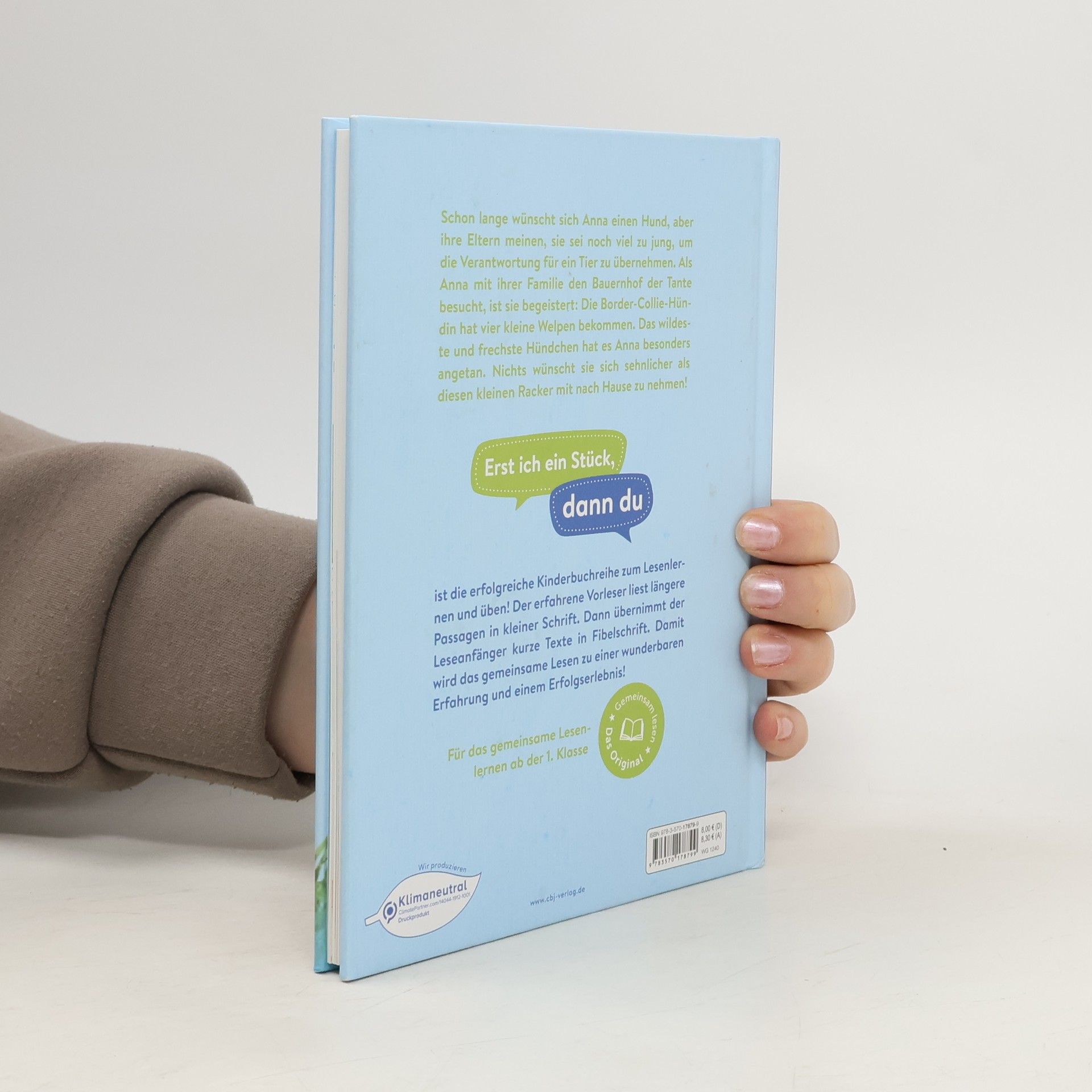 Die erfolgreiche Kinderbuchreihe mit bewährtem Konzept für das gemeinsame Lesenlernen und üben Schon lange wünscht sich Anna einen Hund, aber ihre Eltern meinen, sie sei noch viel zu jung, um für ein Tier die Verantwortung zu übernehmen. Als Anna mit ihrer Familie den Bauernhof ihrer Tante besucht, ist sie hin und weg: Die Border-Collie-Hündin hat vier kleine Welpen bekommen. Anna spielt den ganzen Nachmittag mit den Kleinen. Schweren Herzens verabschiedet sie sich am Abend von den Hündchen, aber als die Familie losfahren will, sitzt der niedliche Welpe Dusty schon auf dem Rücksitz. So einem schlauen Hund, der seine neue Familie selbst wählt, können Annas Eltern auch nicht widerstehen! Wenn das Lesen für Leseanfänger noch mühsam ist, heißt es in vielen Familien: »Lass uns gemeinsam lesen. Erst ich ein Stück, dann du. Wir wechseln uns ab.« Deswegen ist unsere beliebte Erstleser-Reihe »Erst ich ein Stück, dann du« speziell für das gemeinsame Lesen konzipiert: • Leseabschnitte für die erfahrenen Vorleser*innen und die Leseanfänger*innen wechseln sich ab • längere Passagen für Vorleser*innen in kleiner Schrift • kurze Texte für Leseanfänger*innen in Fibelschrift So macht gemeinsames Lesenlernen Spaß! Ausstattung: Mit fbg. Illustrationen